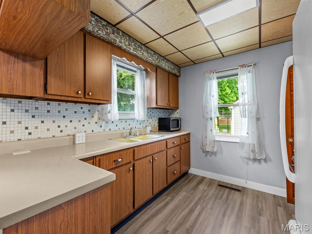 Upon entering, notice the custom front door (automatic charm and character!) as you enter into a welcoming living room with an abundance of natural light. A sunlit kitchen with a charming built-in desk makes for a centralized gathering area. Kitchen appliances include a refrigerator, gas range and microwave. The main floor also offers a full-bathroom and two lovely bedrooms, with a third bedroom featuring walk-in closet for extra storage located upstairs. The finished lower level offers a nice sized multi-purpose room with ample space for entertaining and a full-bath with shower. The unfinished portion of the basement provides the laundry area, utilities and extra storage. Outside, enjoy the fenced yard and cozy patio. A detached two-car garage offers covered parking and workshop possibilities with concrete floors, electric and water. Additional covered parking is provided by a taller detached carport. Updates include a new roof on house and garage(2024), gutters and downspouts replaced (2024) siding on garage (2024) water heater(2021) . Other appliances include washer/dryer on lower level and window unit located upstairs. Additional updates include fresh paint throughout the main level, a recently plastered ceiling in the living room, updated electric, and new flooring throughout the main level and lower level bathroom. Reasonable offer considered.