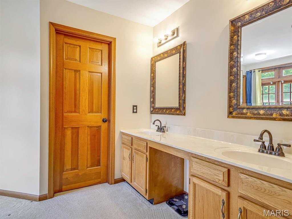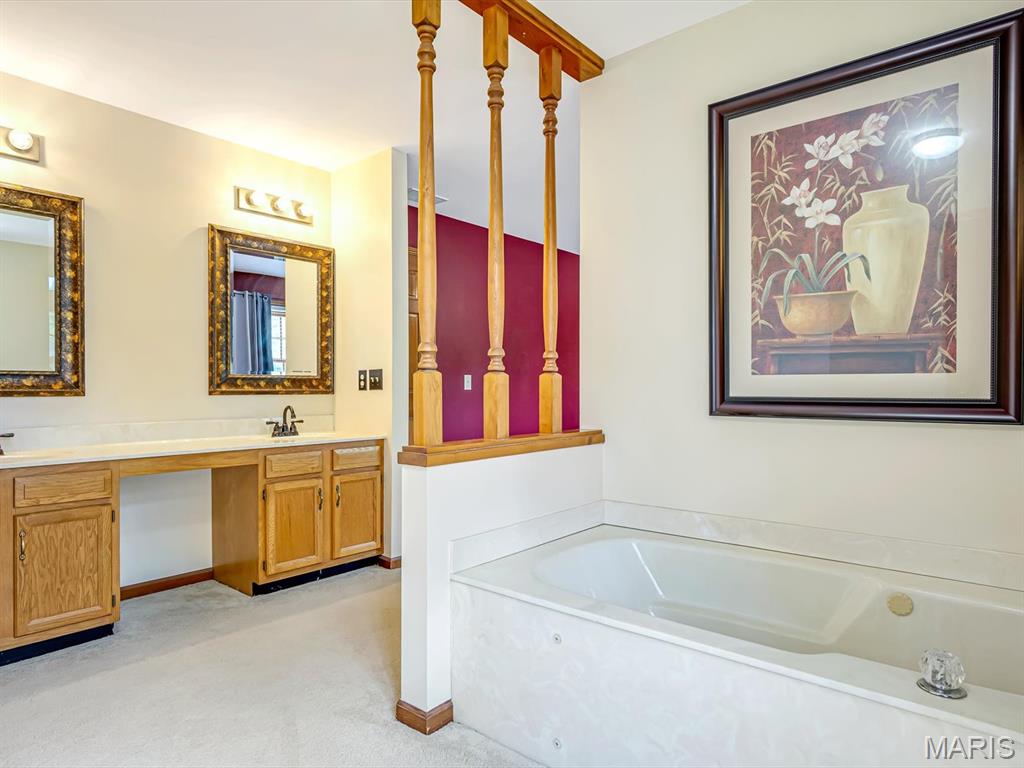 Upstairs, the primary suite is a true retreat with a double vanity, soaking garden tub, and abundant natural light. Two additional bedrooms offer generous closet space and cozy carpeting.