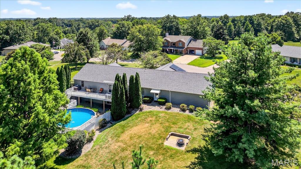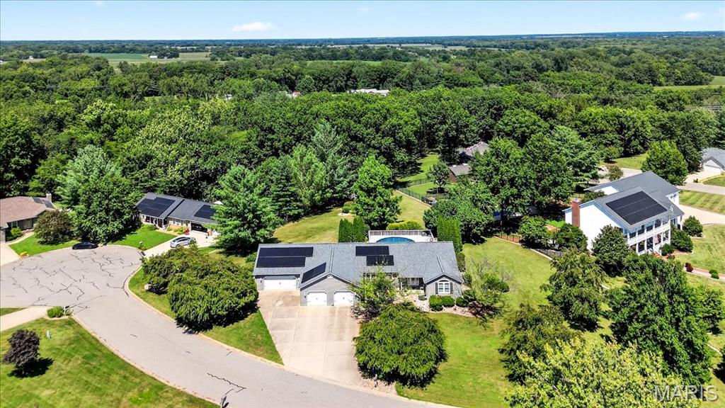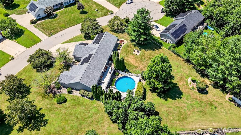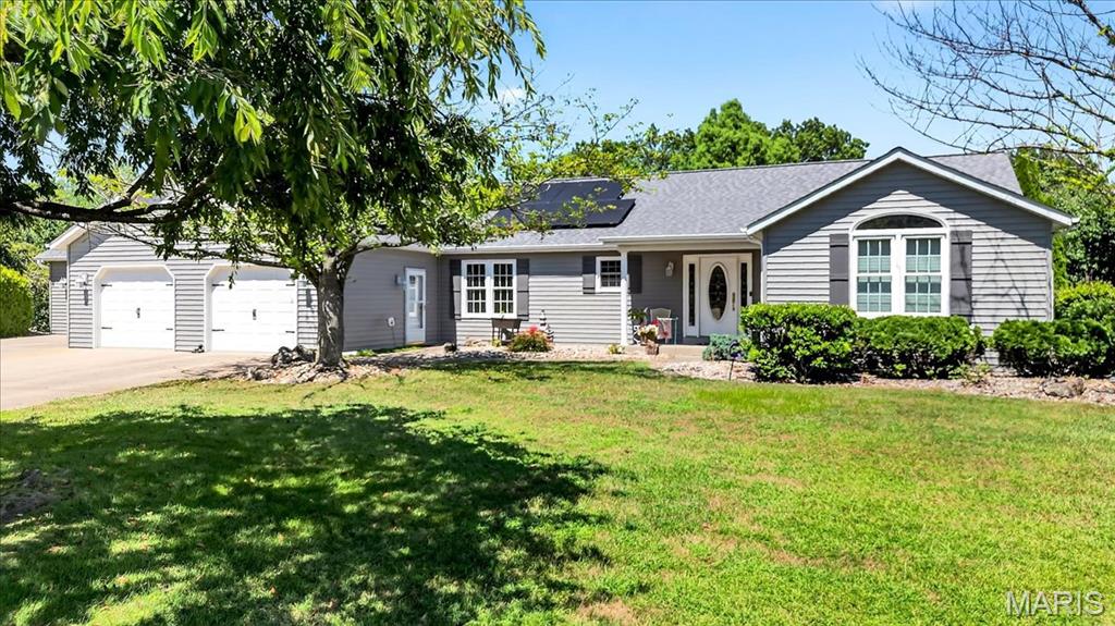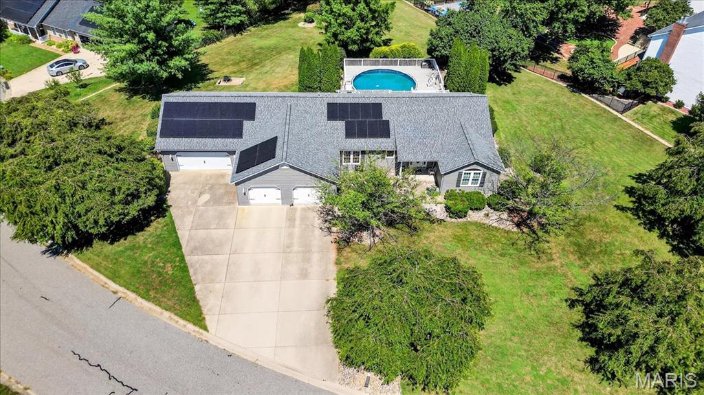 Ofallon School District, Solar, 1 acre; This fabulous home offers 4 bedrooms (all generously sized with lighted closets) & 4 baths. The open floor main level has cozy gas fireplace and sliding doors leading to an expansive, composite deck and pool area. The updated kitchen includes custom cabinetry, Quartz Counters, Island seating & Stainless appliances. The master bedroom suite, 2nd bedroom and a bath complete the main level. The lower level has a large family room with entertainment center and sliding doors to a walk-out patio. 2 Add’ll bedrooms plus a bonus room (currently used as non-compliant 5th bedroom), a full bath & laundry complete the lower level. Lower level has low maintenance LVP floor throughout. There’s a 623 sq ft bonus space on the main level off the garage with private entrance, separate heat/cooling, kitchen & 1/2 bath for endless possibilities; home business, additional living quarters, gym, Entertainment space etc. The garages are the multi-car family & car enthusiasts’ dream w/ parking for 6 cars /boat/camper etc. A 12 x 19 Shed in the back yard provides additional storage. The yard with mature shade trees is nicely landscaped, just a beautiful property. Solar panels will be paid for in full by seller, the electric bill runs about $21/month, propane tank to fill as needed. Generator for peace of mind. Roof June 2025, siding & shutters July 2025, HVAC 2015. Above ground pool is saltwater and comes with equipment. About 15 minutes to SAFB and Hospitals.
