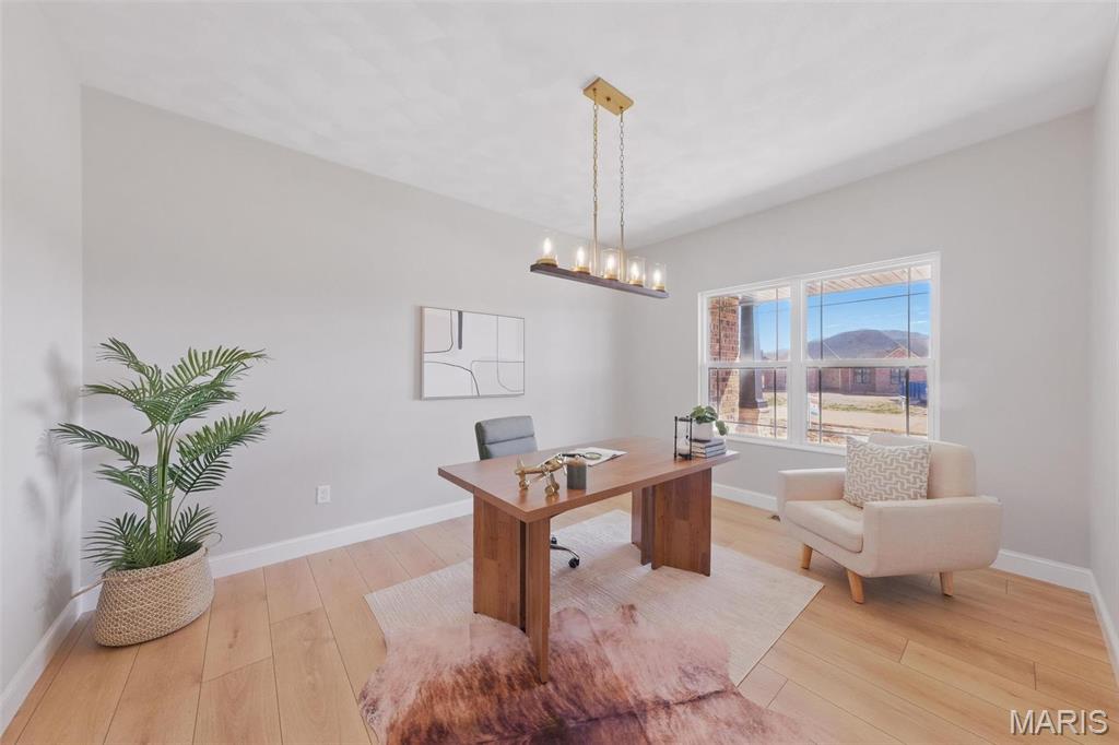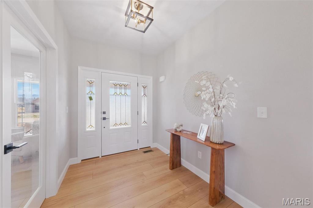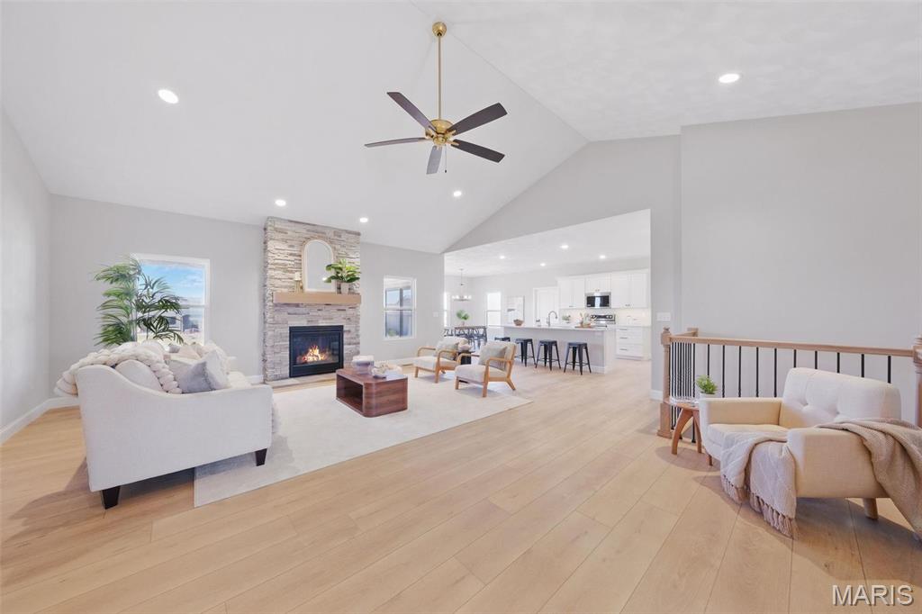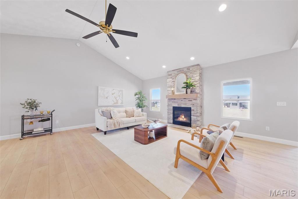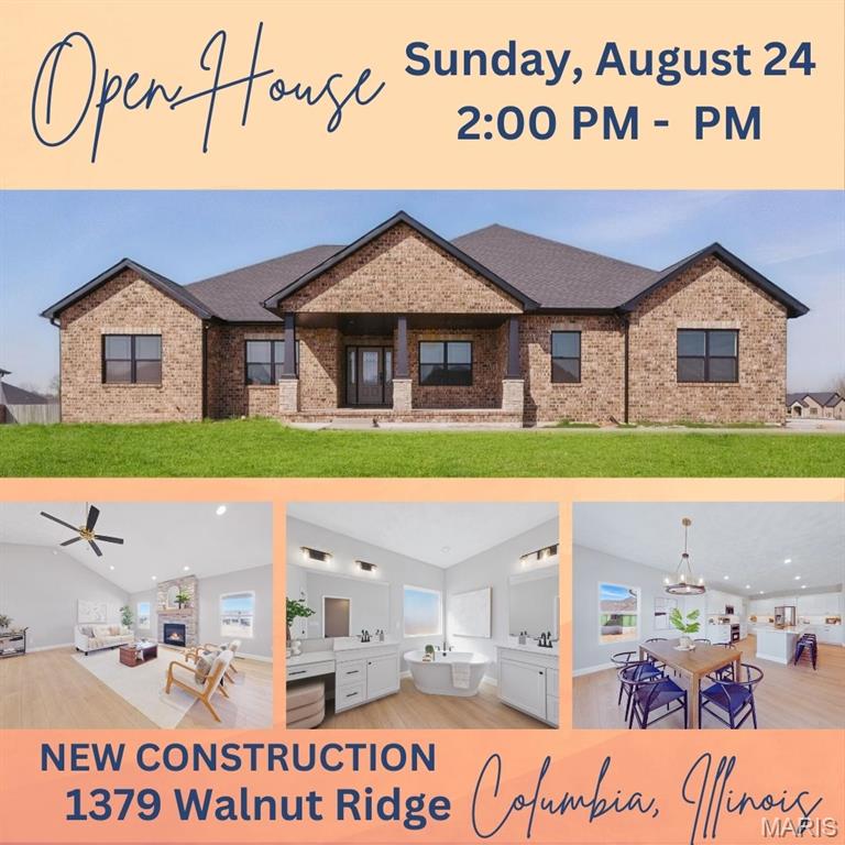 Experience luxury and convenience at 1379 Walnut Ridge in Columbia, IL. This exquisite 2,500+ square-foot 1 story home showcases three sides of brick and spacious three-car side entry garage. Inside, the living room boasts a vaulted ceiling and gas fireplace framed by a floor-to-ceiling stone hearth. A flexible dining room or home office offers lots of opportunity. Chef-ready kitchen with stainless steel appliances, quartz countertops, a center island, and a generous walk-in pantry. Main-floor primary suite is a sanctuary, featuring nine-foot ceilings, recessed lighting, a walk-in closet, and a spa-like bath with a double-bowl vanity, separate shower, and corner soaking tub. You’ll also appreciate the convenience of main-floor laundry. Step outside to a covered composite deck—complete with ceiling fan and recessed lighting—perfect for savoring sunset views. A walk-out basement with nine-foot ceilings and egress windows offers the option to create a fourth and fifth bedroom or additional living space before closing. Located just 5 minutes from Historic Main Street with restaurants, shopping, and community events. Easy highway access to St. Louis, this move-in-ready home provides an easy commute to Scott Air Force Base and STL International airport. Don’t miss your opportunity to own this gorgeous home with luxury finishes & unbeatable location—schedule your private tour today or stop by the OPEN HOUSE either (or both) Sunday, August 24 2:00 PM – 4:00 PM.
