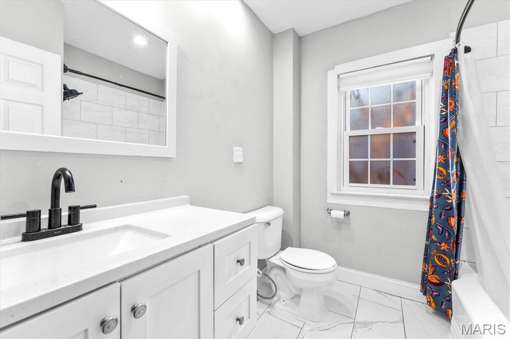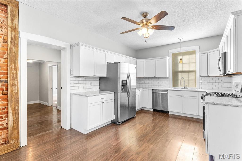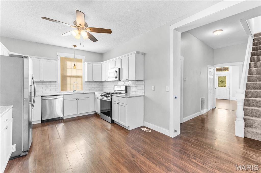 Take a look at this historic 1 1/2-story brick home with a charming covered front porch! On the main level, you’ll find high ceilings throughout, a spacious living room, and an updated kitchen. The primary bedroom features double closets, and the bathroom has a tiled floor and bath surround, along with a convenient laundry room. A staircase leads to a generous upper bedroom. You’ll love the remodeled kitchen, which boasts newer countertops, white cabinets, a sink, stainless steel appliances, a dishwasher, a gas stove, a microwave, and a refrigerator. Off the kitchen, a door opens to a large, flat, fenced backyard. There is also an alley behind the home and a shed for additional storage. Notable upgrades include a newer air conditioner, furnace, and water heater, all of which are approximately 5 years old. Enjoy the peaceful and friendly neighborhood, with easy access to the YMCA, bike trails, recreation center, shopping, restaurants, and schools, as well as SAFB and St. Louis. This house is move-in ready!