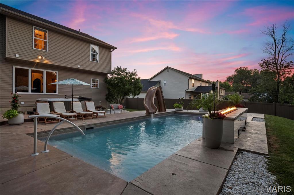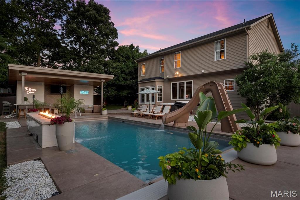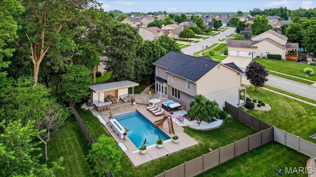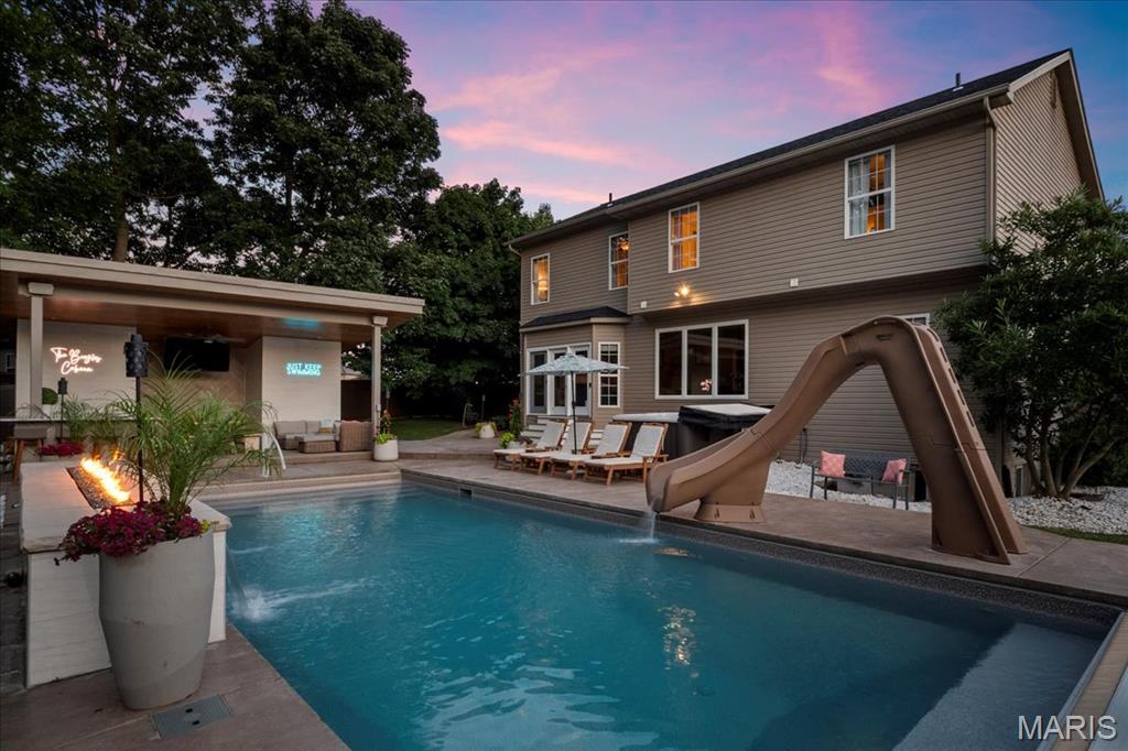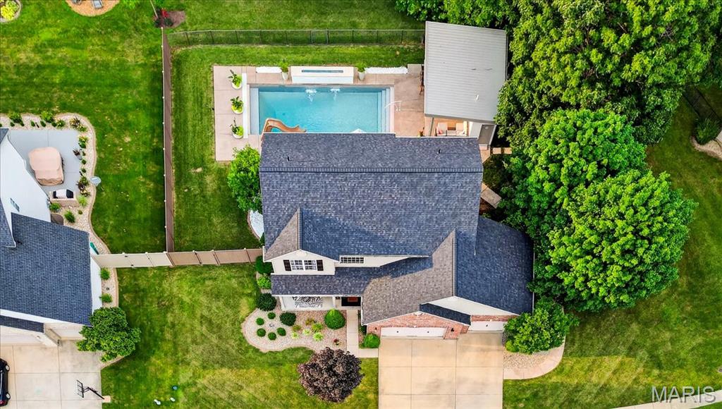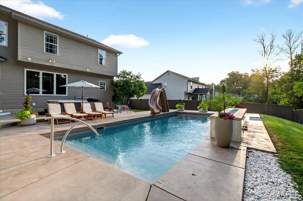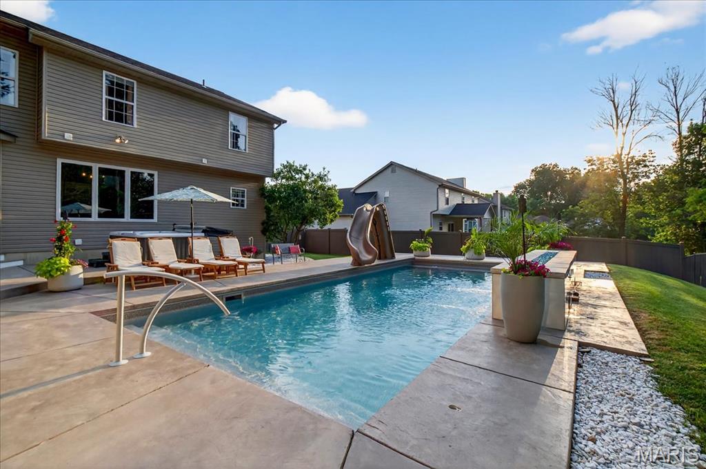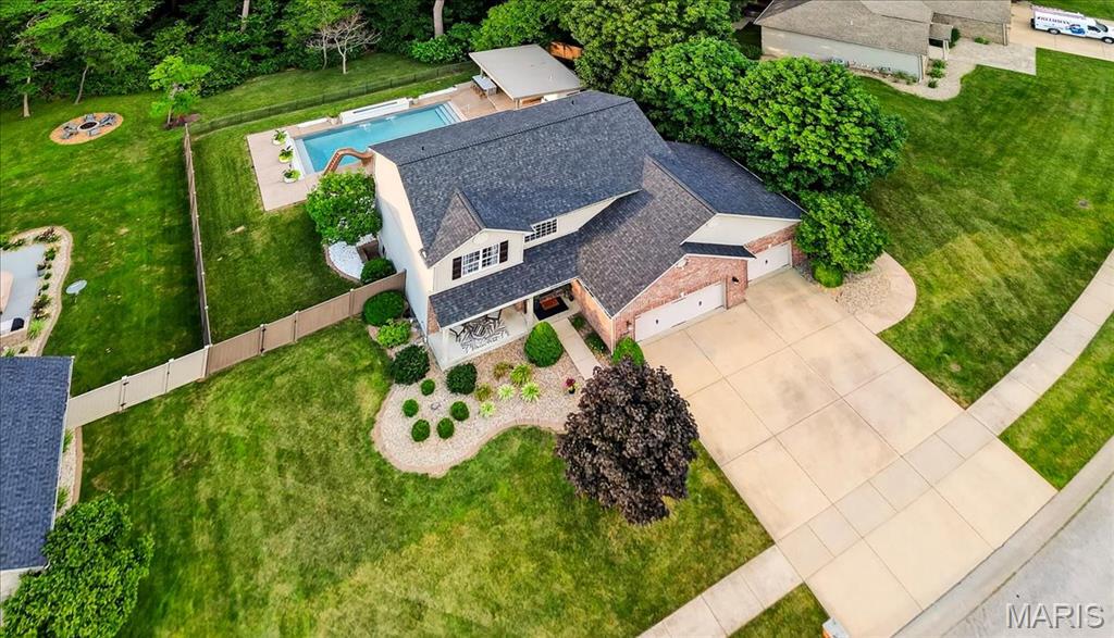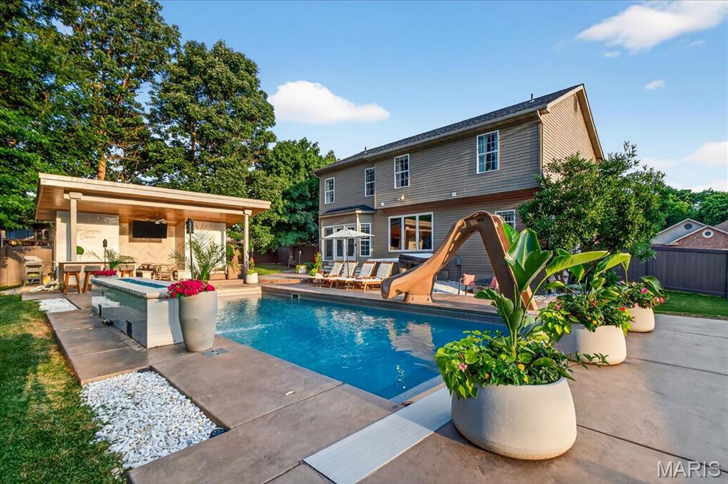 WELCOME TO THIS BEAUTIFUL HOME THAT TRULY CHECKS EVERY BOX! This updated 4-bedroom, 3.5-bath home offers thoughtful design and luxury finishes throughout. Step inside to gorgeous porcelain flooring that flows through the main level, a formal dining room w/ elegant molding and new fixtures, and an incredible kitchen featuring a large island w/ matte black accent, floating shelves, range hood, and all NEW appliances, including a double oven. Enjoy cozy evening by the fireplace w/ a whitewashed finish and NEW mantle, perfectly complemented by a charming picture window that overlooks the inground pool. The finished basement expands your living space w/ a full bath-ideal for guests or entertaining. Outside is a backyard paradise w/ nearly 200K in upgrades, including a stamped concrete patio, a heated saltwater pool, outdoor granite bar w/ mini fridge and a pool house w/ its own bathroom & storage. Additional features include an epoxy garage floor w/ a golf simulator (screen & projector included), updated water heater & HVAC and NEW roof! Conveniently located close to the sports park, bike trails, schools and more. MUST SEE!