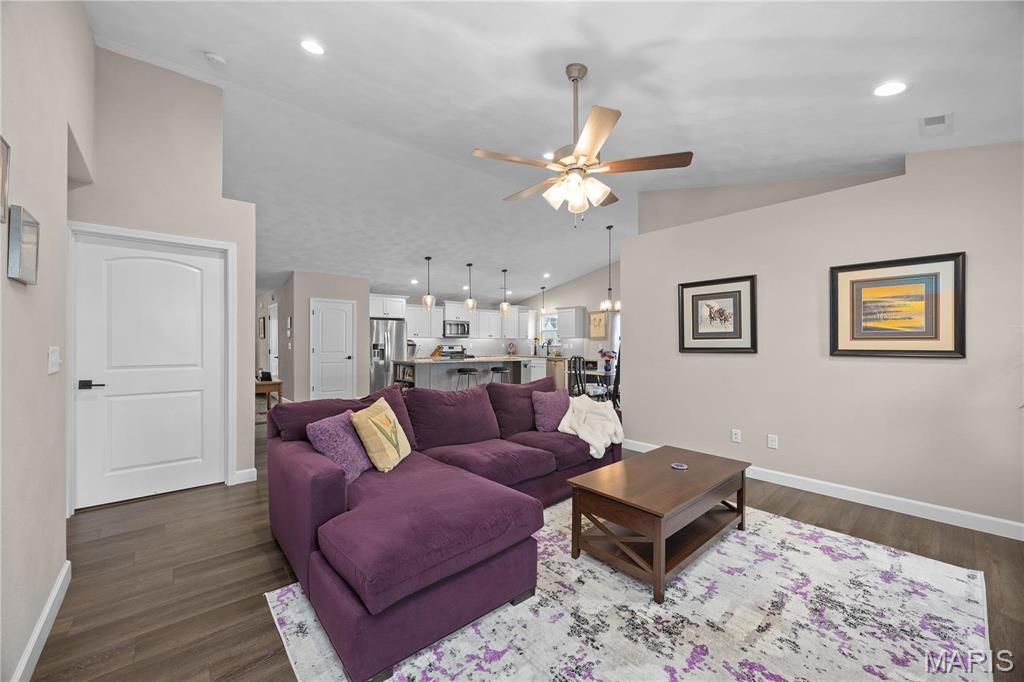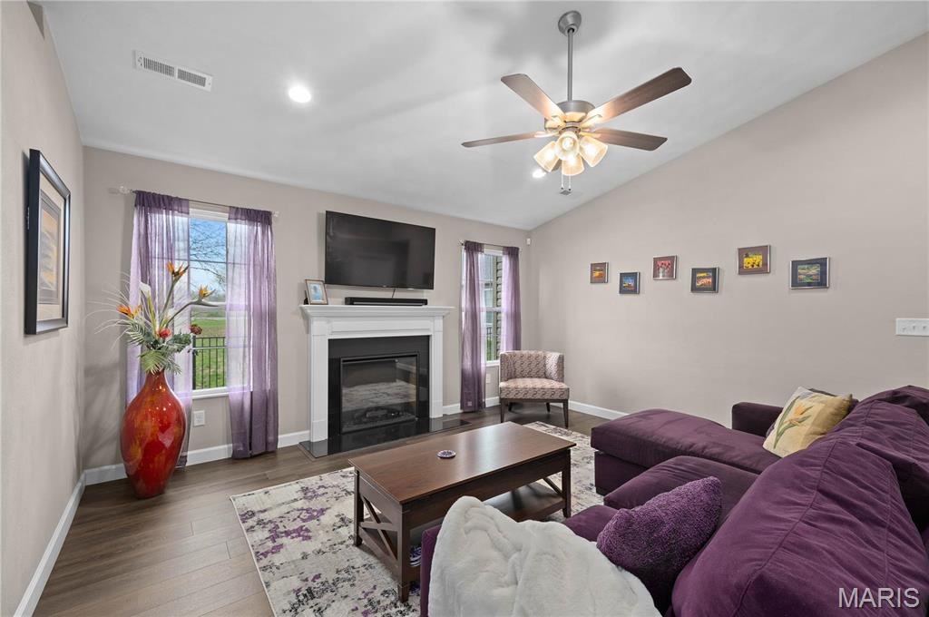 Experience the perfect blend of relaxation and lifestyle in Lakeside Estates. This beautifully designed ranch home offers an open and inviting floor plan with 2 bedrooms and 2 full baths. You’ll fall in love with the well-appointed kitchen, complete with a stunning 9-foot island, abundant cabinetry, and sleek stainless-steel appliances perfect for everyday living and entertaining. Soaring vaulted ceilings extend from the dining area into a bright and airy living room featuring a cozy gas fireplace. The primary suite is a true retreat, boasting a tray ceiling, a luxurious 6-foot shower, double vanity, and a custom walk-in closet with direct access to the laundry room for added convenience. Enjoy the outdoors with a screened-in patio and fenced yard or take a stroll along the scenic walking path around the community’s lake complete with two fountains, a gazebo, and plenty of fish. Minutes from Scott AFB, schools, parks, and more!