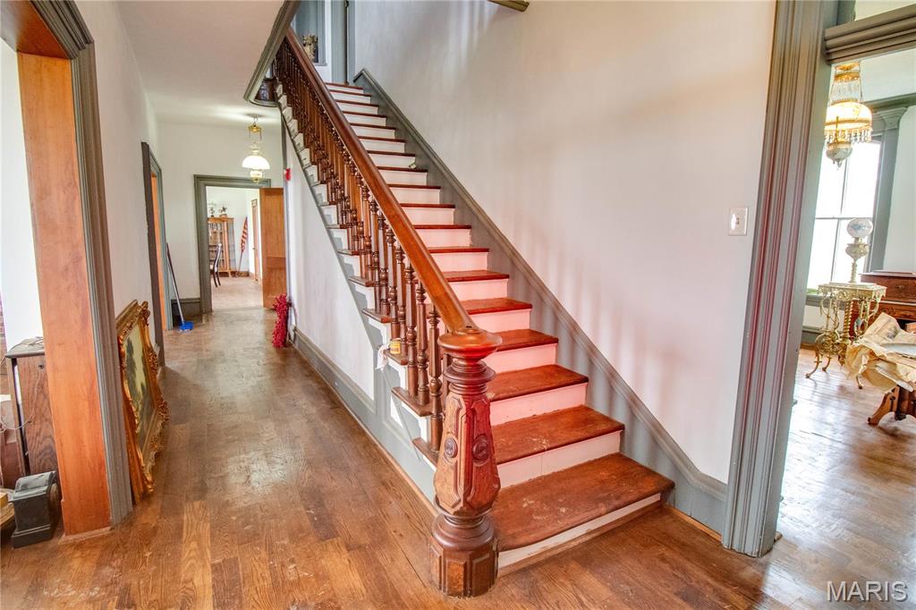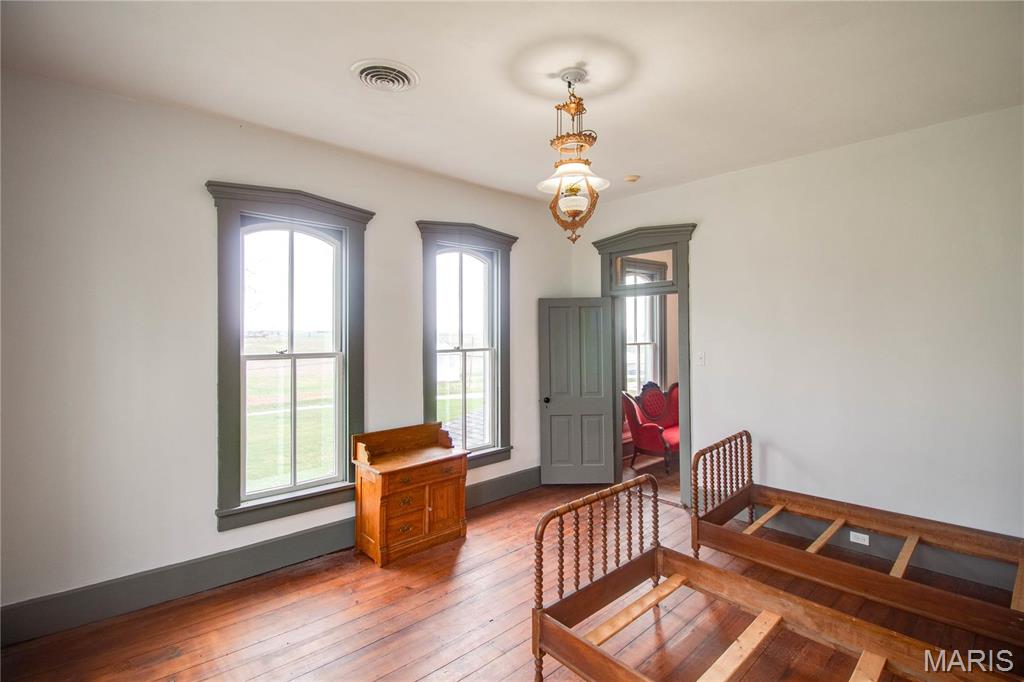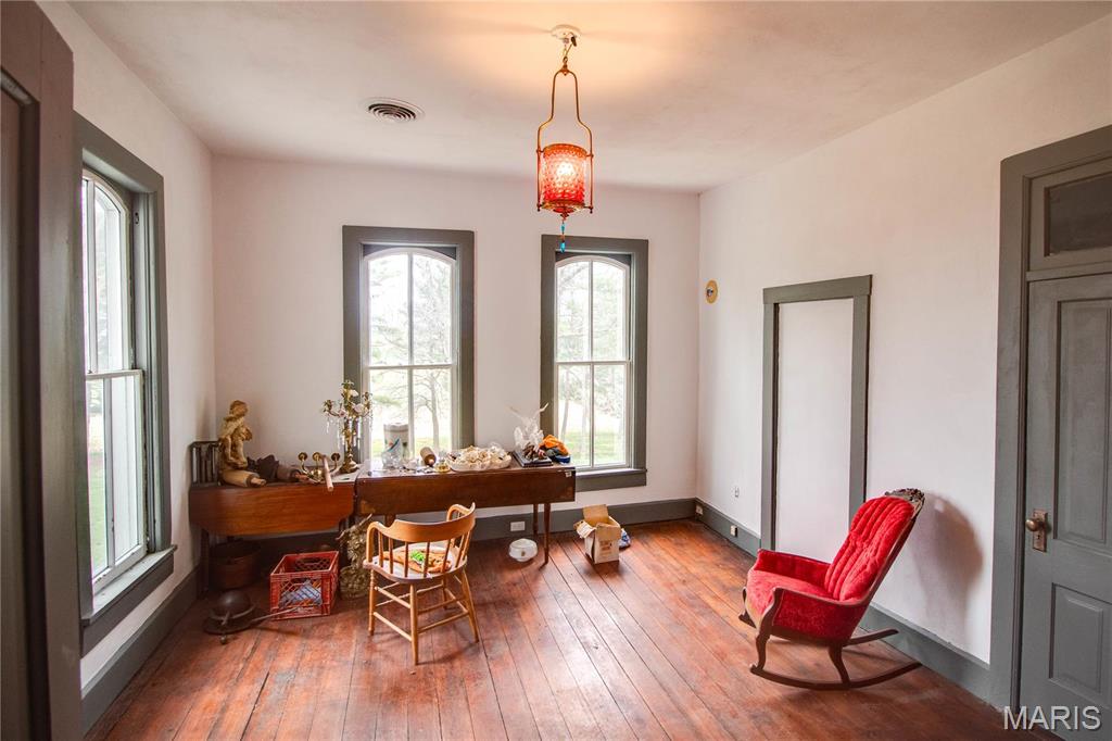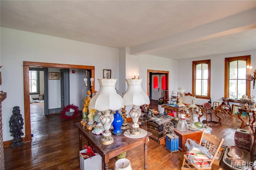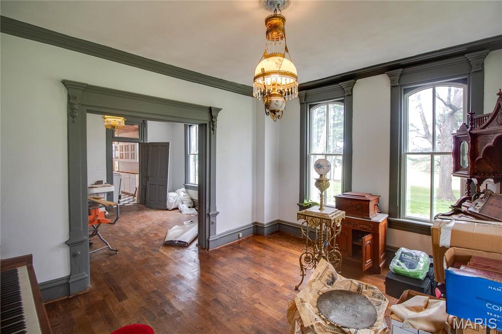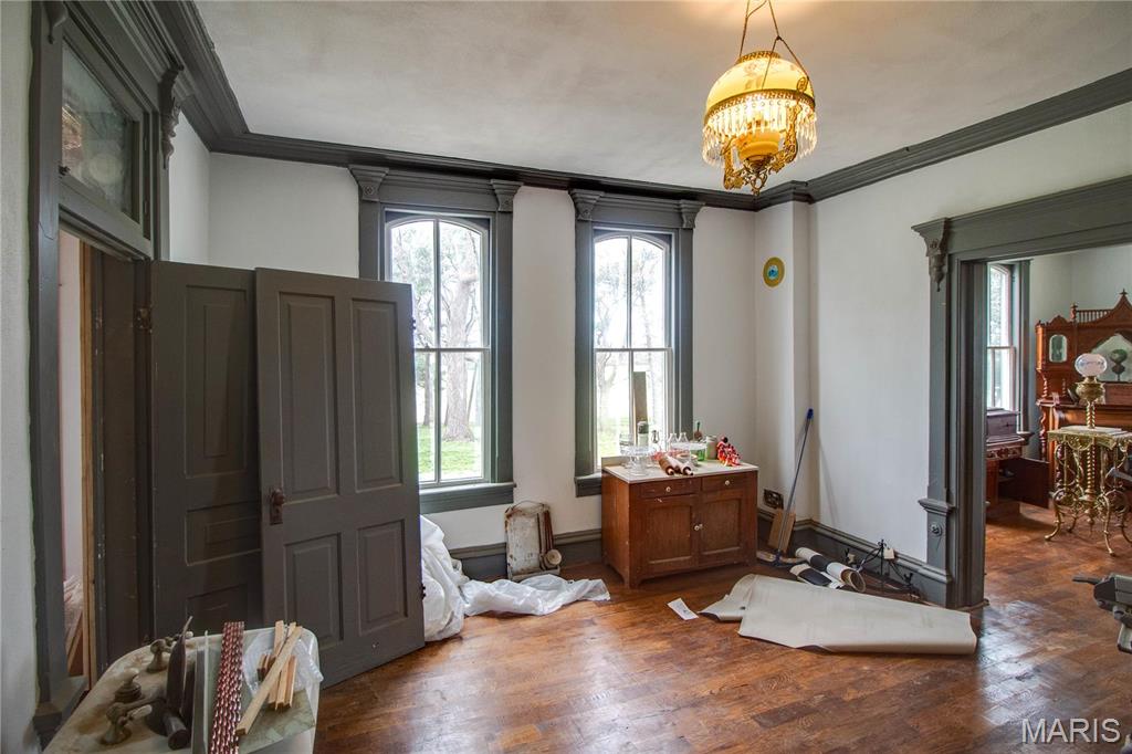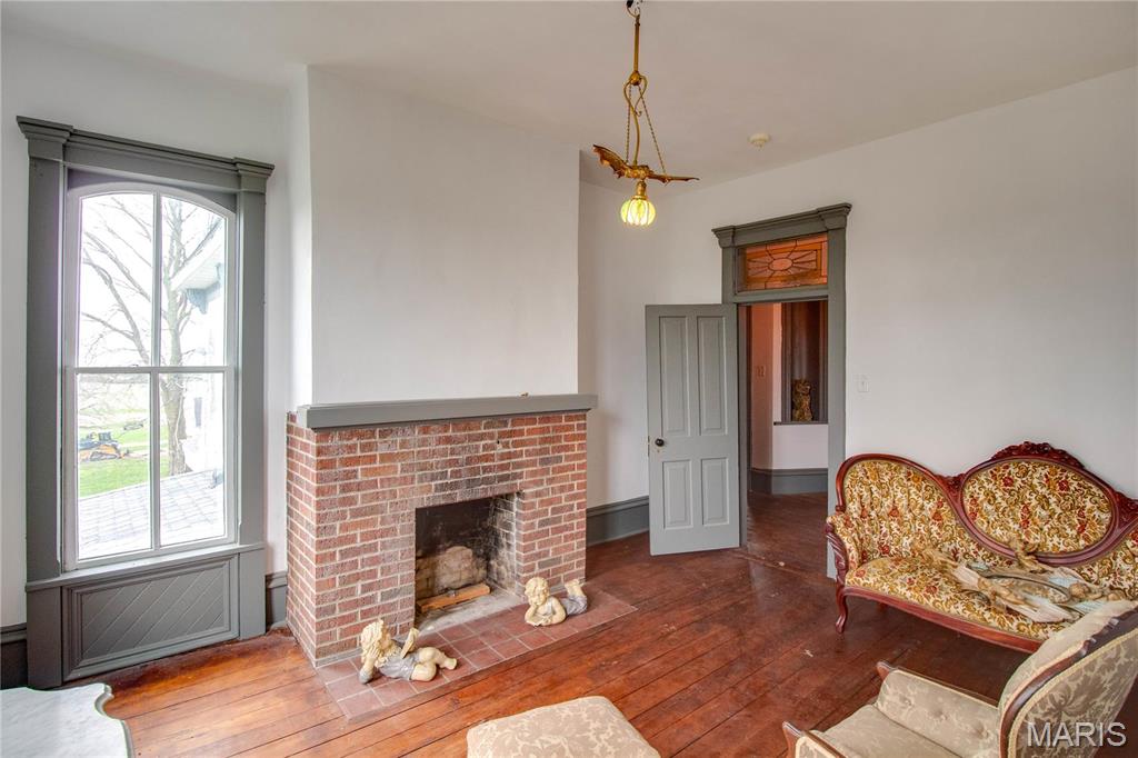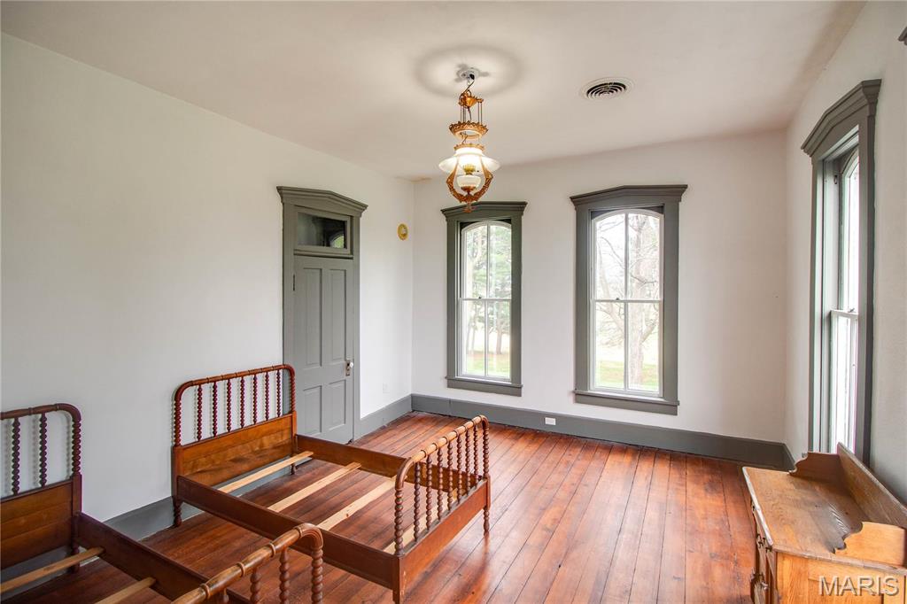 Main house boasts a two-story entryway, spacious living & sitting rooms, formal dining room, breakfast room w/ wood flooring throughout, 6 bedrooms & 2 partially finished baths. Partially finished kitchen offers customization potential. Upstairs includes a large sitting area, all 6 bedrooms, & a second partially finished kitchen accessible via back staircase. Lower level is an unfinished brick space w/ laundry hookups.