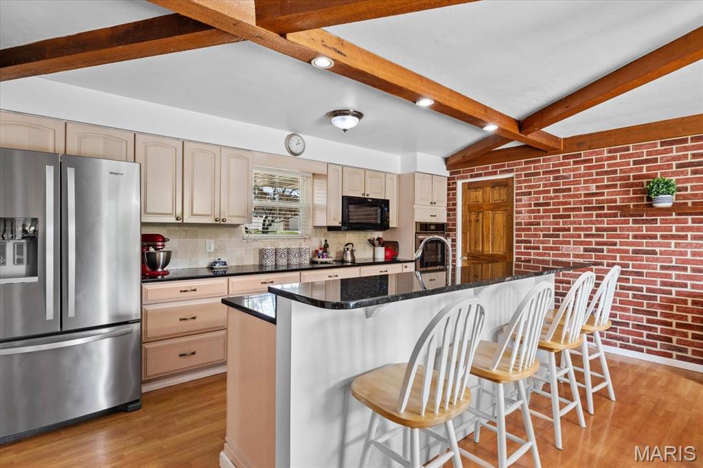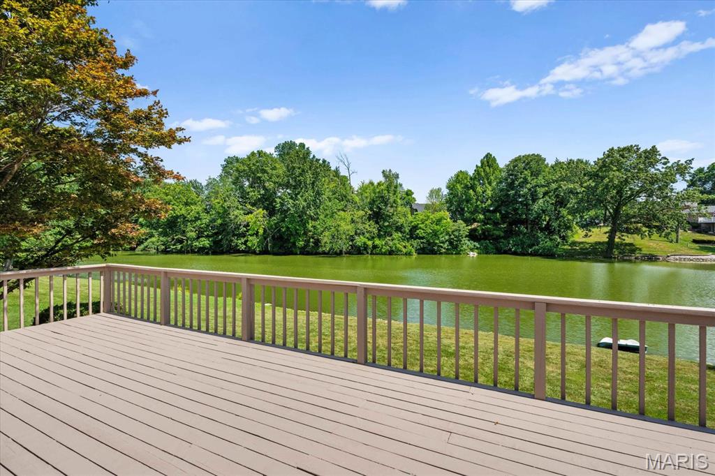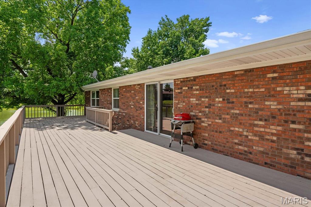 The main-level master bedroom features a tranquil en-suite bath, while two additional bedrooms offer cozy accommodations near a contemporary full bath with a stylish double vanity. The heart of the home is the kitchen, blending style and functionality, with beamed ceilings, recessed lighting, solid surface countertops, a spacious island, and modern appliances for easy cooking. A unique brick wall adds rustic charm, complemented by lovely views. Step out to the expansive deck—perfect for barbecues and relaxed evenings. The fully finished basement offers versatility, featuring a family room with a wood-burning fireplace and a dedicated bar area, ideal for entertaining. A walkout feature provides easy access to the outdoors. Explore this remarkable waterfront property with great golf course access and proximity to top-quality schools in a friendly community. Schedule your private tour today to experience this exceptional home!