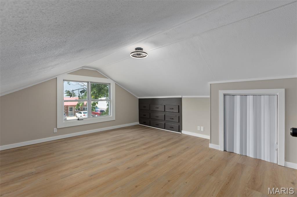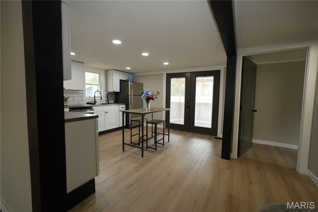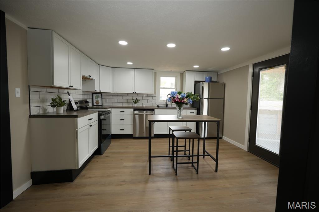 This stunning home has been completely renovated from top to bottom—featuring a new roof, AC, siding, fascia, soffit, garage door, privacy fence, lighting, cabinets, flooring, and appliances. The spacious living room includes a fireplace and large windows overlooking a private, fenced yard. The open-concept dining/living space offers flexible use. The kitchen boasts butcher block counters, modern cabinetry, ample storage, and room for a dining set. The lower-level primary suite includes a walk-in closet and a private bath with subway-tiled tub/shower. A half bath and private laundry room complete the lower level. Upstairs, two large bedrooms with built-ins and new flooring flank a full bath and bonus loft space—ideal for an office or playroom. Enjoy the oversized detached garage with upper loft and two rooms—perfect for a workshop, studio, or future guest space. The newly landscaped yard is prepped for hydroseeding. A truly move-in ready home with room to grow!