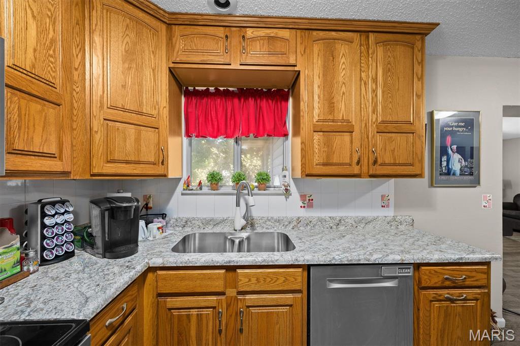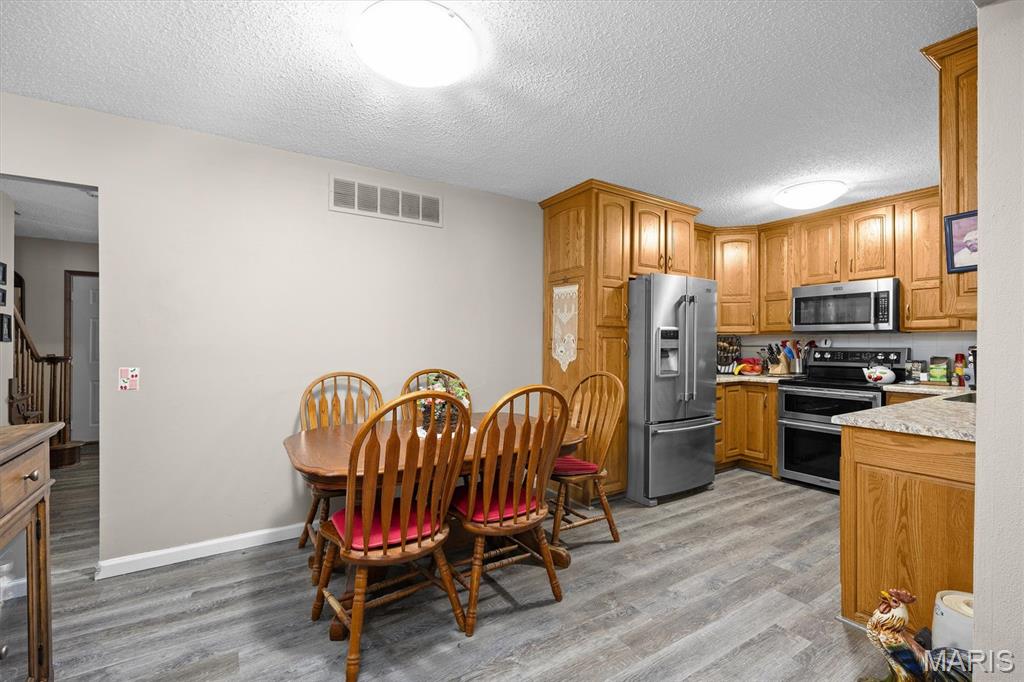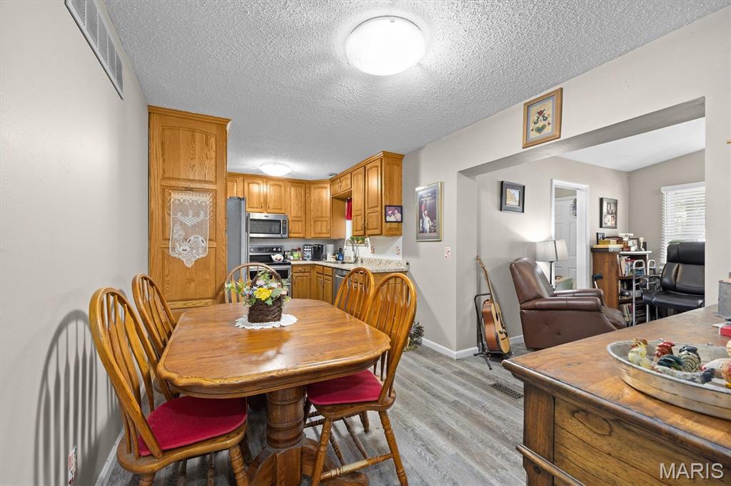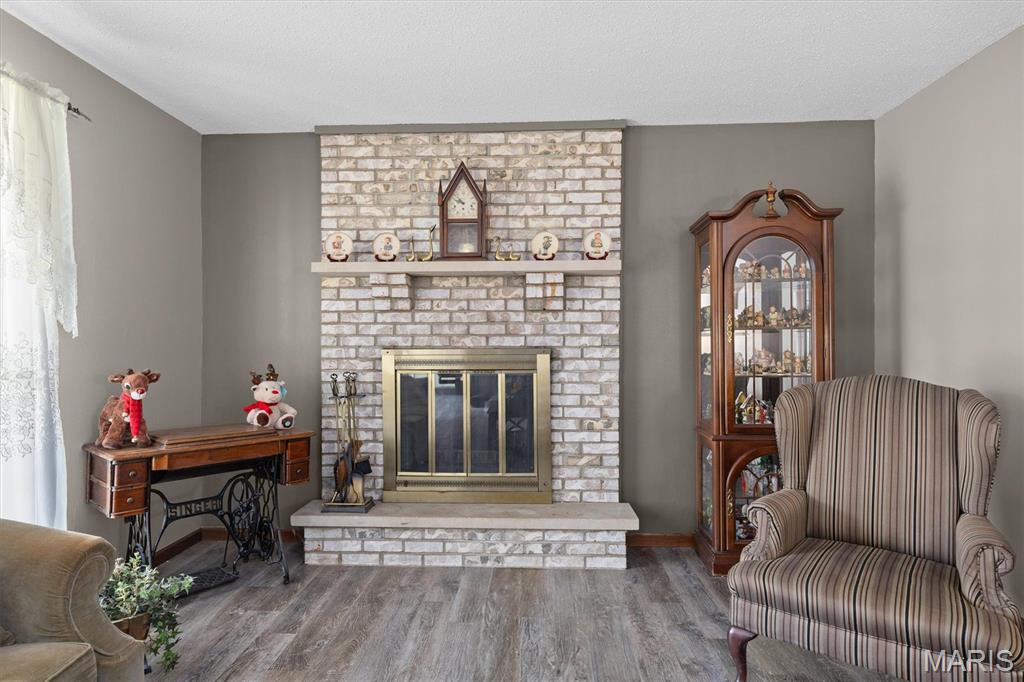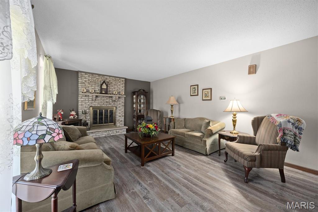 Step into this lovely residence and be greeted by a large living room featuring a classic brick, wood-burning fireplace—perfect for cozy evenings. The home flows seamlessly into an eat-in kitchen with rich wood cabinetry and stainless steel appliances, ideal for everyday meals and entertaining.