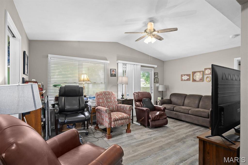 Enjoy gatherings in the expansive family room, boasting a vaulted ceiling and French doors that open to a fully fenced backyard. The outdoor space includes a covered wood deck, patio, and storage shed—a great setup for relaxing or hosting guests.