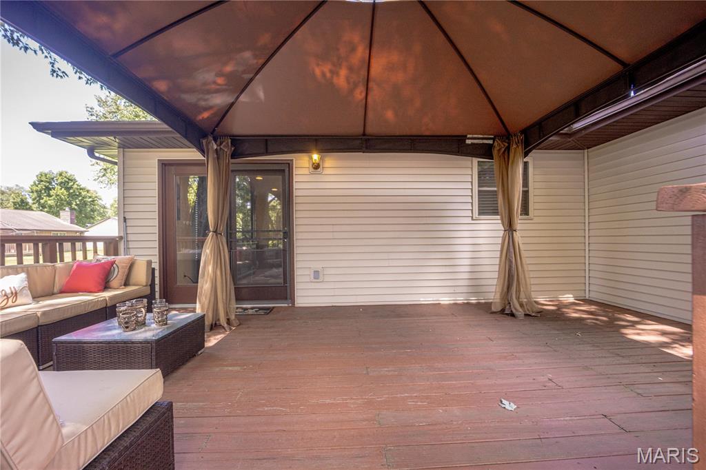 Down the hall, the primary suite includes a full en-suite bathroom, accompanied by two additional bedrooms sharing another full bath. A cozy family room with a propane fireplace opens to a large all-seasons room filled with natural light, tiled floors, and views of the beautifully fenced backyard. The backyard is an outdoor oasis with a deck under a gazebo, perfect for relaxation.