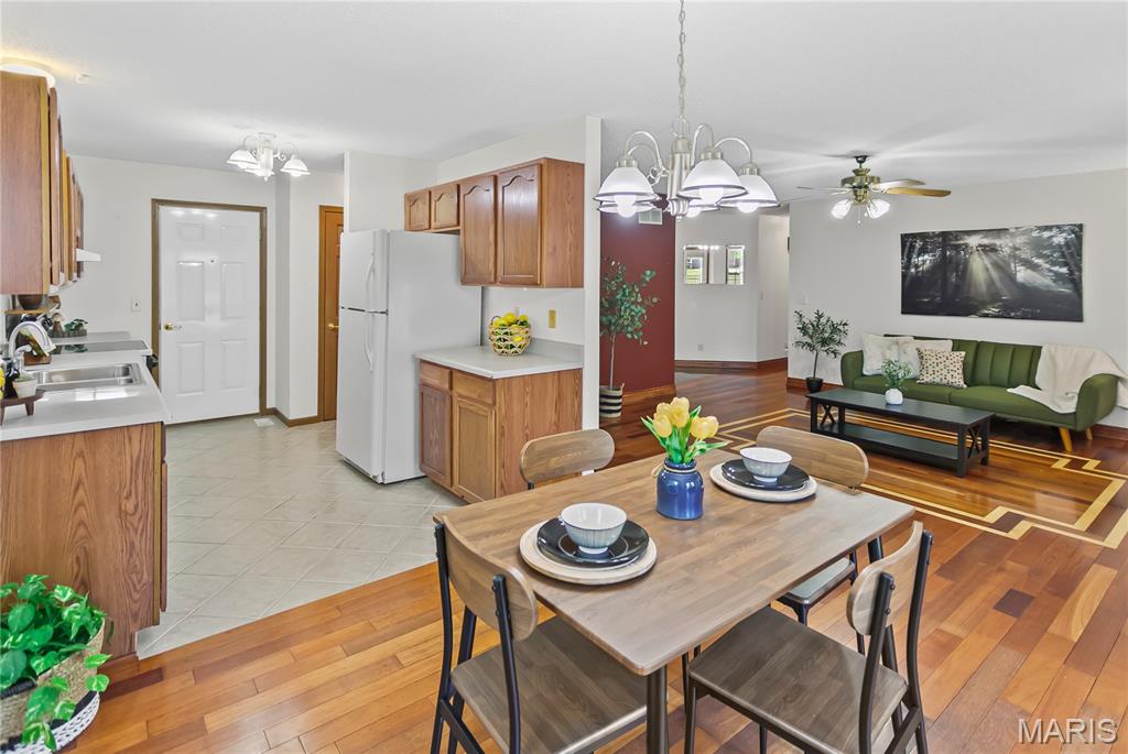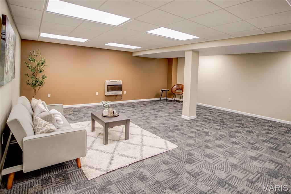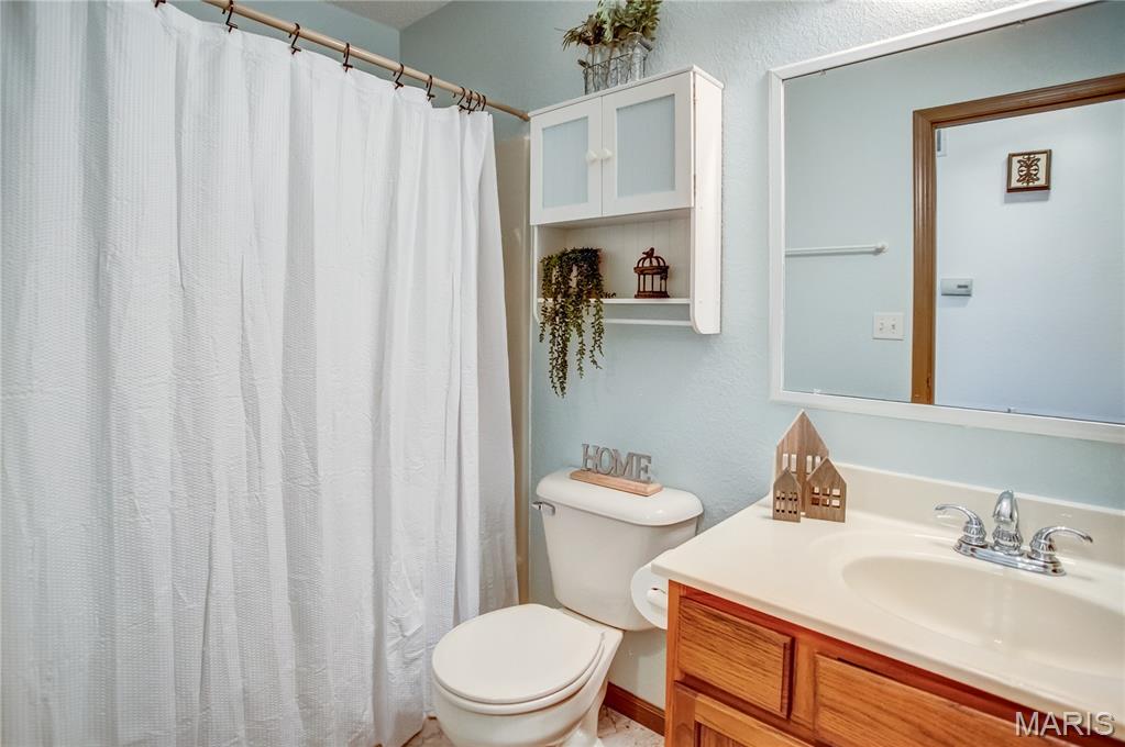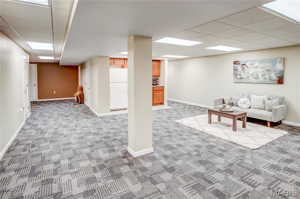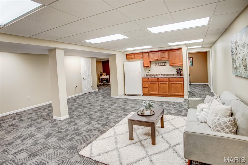 Welcome to this beautifully maintained home featuring 2 spacious bedrooms, including a master suite with a walk-in closet and a double vanity in master bathroom. The living room offers vaulted ceilings and a cozy gas fireplace, while the gorgeous hardwood flows throughout some of the main living area. The kitchen is equipped with a pantry and all appliances stay. The main floor also includes a convenient laundry room with lots of storage. The lower level boasts a kitchenette with a sink and refrigerator, a remodeled bathroom with shower, and a separate office space-ideal for working from home. Also, has fiber internet available. Additional features include a full hallway bathroom on main level. Step outside to a large backyard with a generous concrete patio, perfect for entertaining, along with a covered front porch as well. The oversized 2 car garage includes a slop sink and the roof is 3 +/- years old. From cozy mornings by the fireplace to evenings on the patio, this home is ready to hold your next chapter.