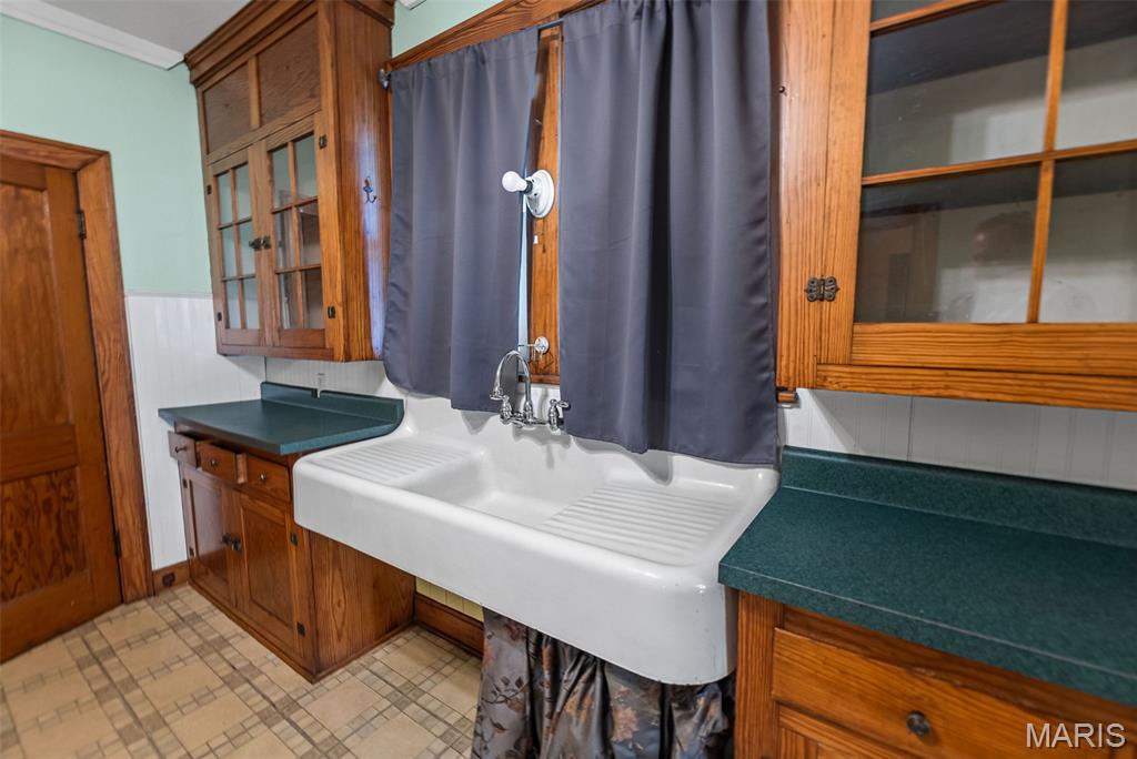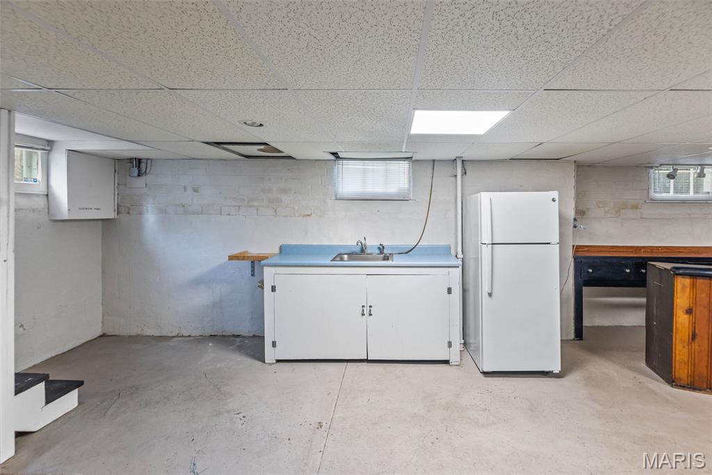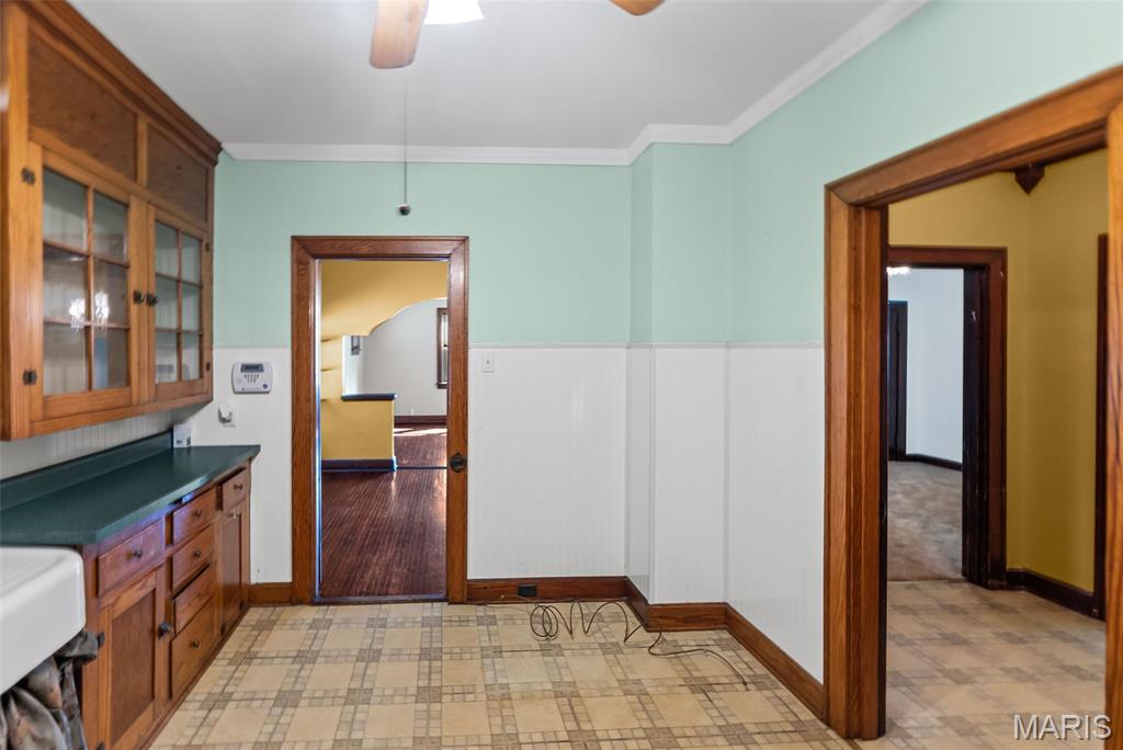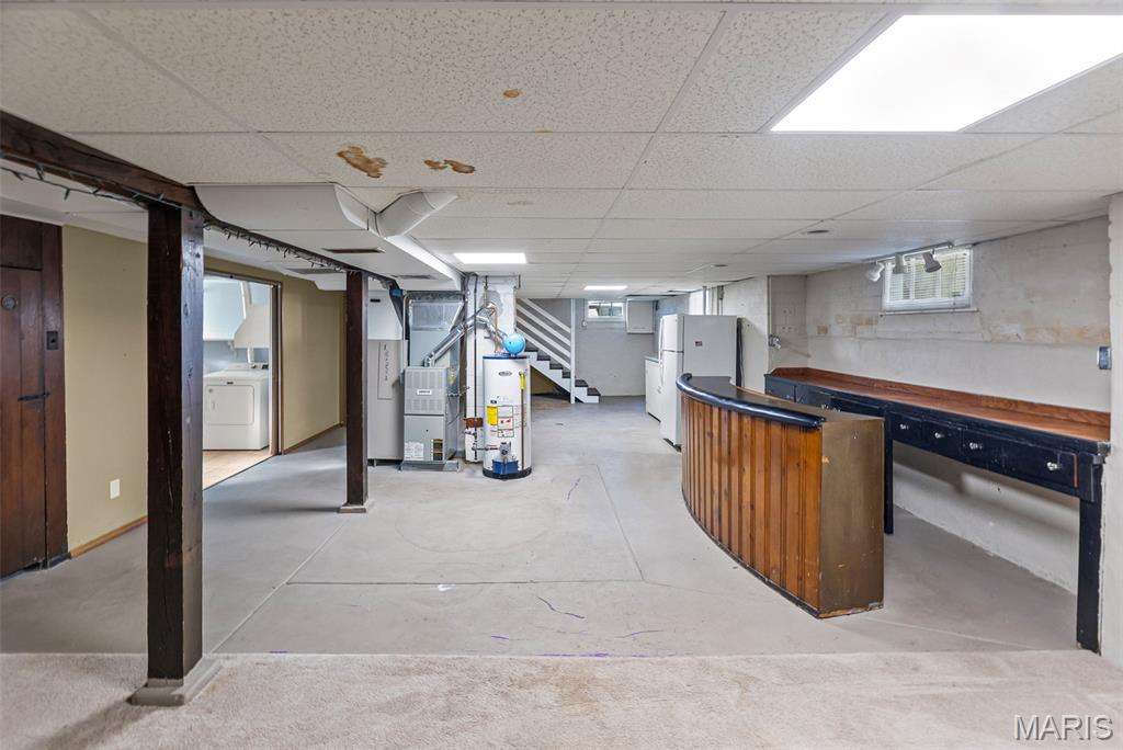 This is a brick bungalow with a private vinyl-fenced backyard. The detached one-car garage is convenient to the private fenced back yard and entrance to the home. The interior features stained glass windows, hardwood floors, and beautiful, ornate kitchen cabinets. The over sized farm sink in the kitchen is original and in great condition. There is a small butler’s pantry off the kitchen that can be used for additional storage. The lower level has a full bathroom and a bonus room with a window that does not meet the requirements for an egress bedroom. There are two bedrooms and a full bath on the main level and a non compliant bedroom in the basement. There are endless possibilities in the home, and the brick exterior with vinyl fencing is a plus. The front of the home is landscaped with a small retaining wall which adds to the appearance of the well landscaped yard.