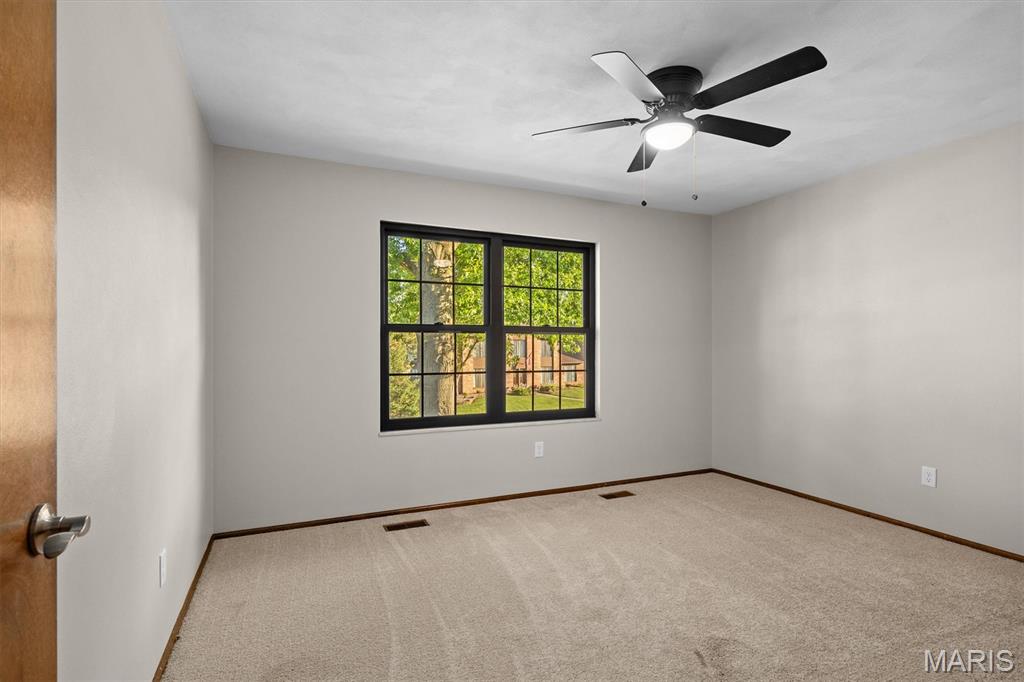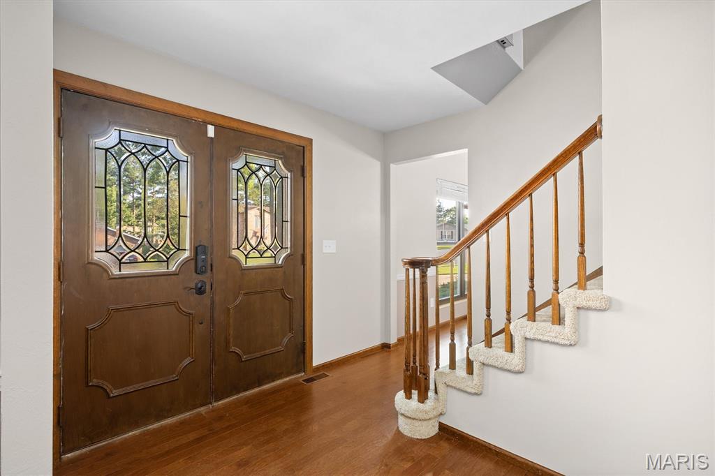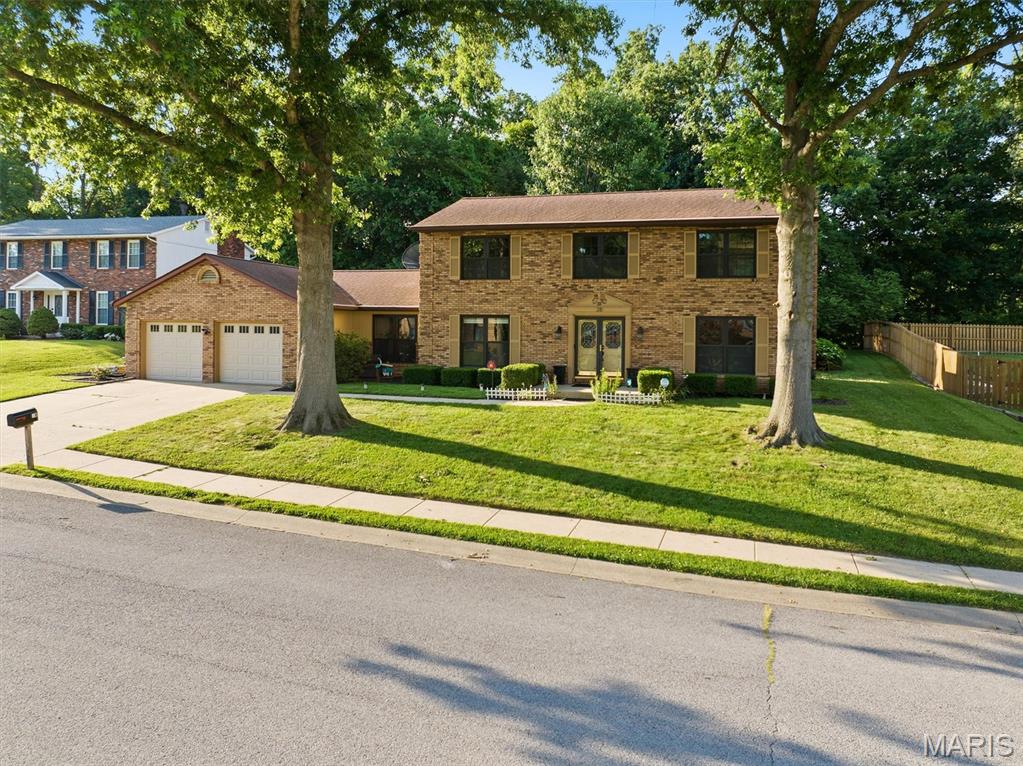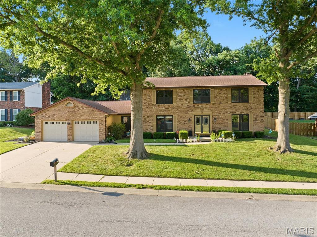 Cul-de-sac living at its finest! This beautifully updated 5 bed, 2.5 bath home backs to serene woods and features a side garden perfect for the green thumb. Formal living and dining rooms complement the spacious family room with a striking fireplace and access to the patio. The updated kitchen boasts white cabinetry, quartz counters, custom-paneled fridge, and wooded views. A large main-level bedroom is ideal for guests or a home office. Upstairs, find 3 bedrooms, a refreshed hall bath, and a spacious primary suite with walk-in closet, ensuite, fireplace, and private balcony. Oversized 2-car garage with EV outlet and attic storage. Updates: Renewal by Andersen windows (2021), HVAC (2021), water heater (2023), roof (2012). Located in sought-after O’Fallon schools and minutes to downtown.