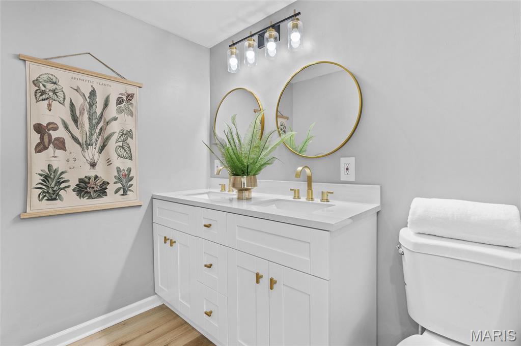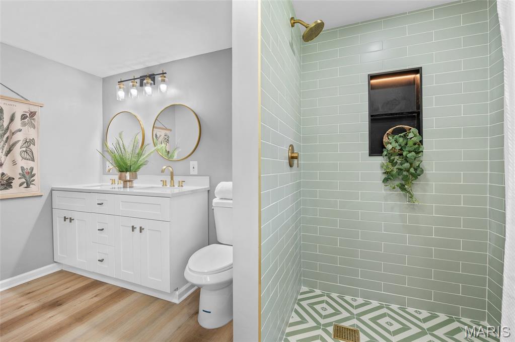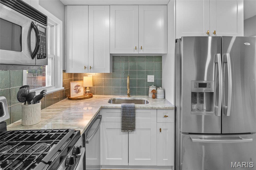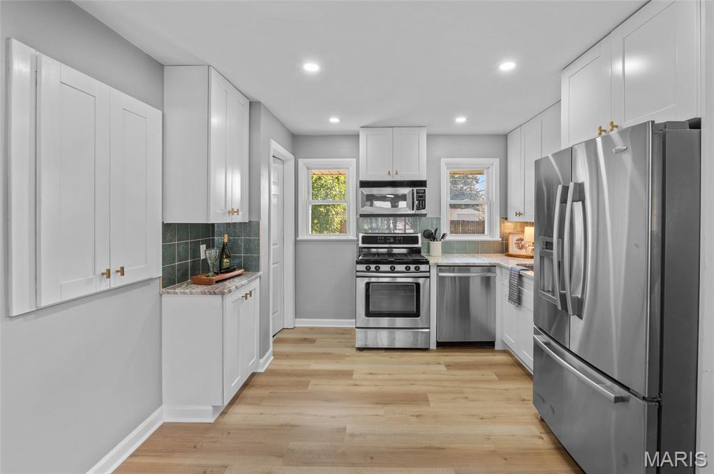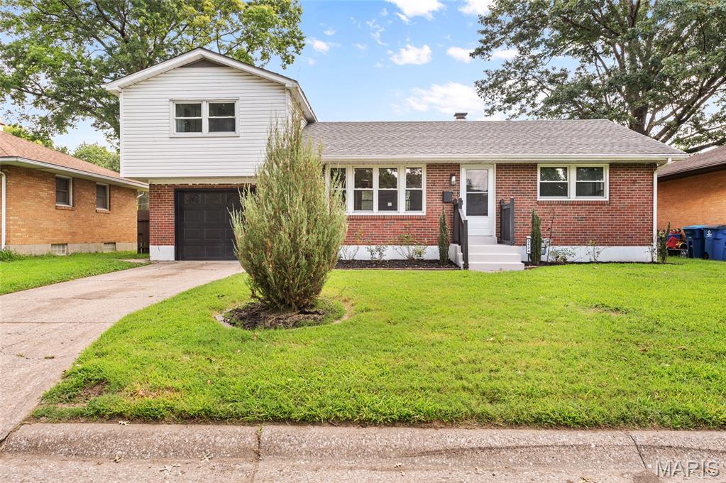 3424 Lydia Lane is a true show stopper! Step inside this beautiful 3-bedroom, 2-bath home filled with stylish updates and thoughtful details throughout. The private primary ensuite is the star of the home—featuring a spacious bedroom, oversized walk-in closet, dual vanities, and a stunning tiled walk-in shower. Enjoy open concept living on the main level with a feature wall, coved ceilings, a wall of windows, and luxury vinyl plank flooring. The upgraded kitchen is sure to impress with 42″ cabinets, custom tile work, built-in pantry, elevated lighting, and gold accents. Two additional bedrooms complete the main level, while the lower level offers a cozy family room with new carpet—perfect for relaxing or entertaining. The oversized one-car garage provides both interior access and entry to the fenced yard. Major improvements include brand-new plumbing in the primary bath and a new sewer line from the home to the city main. Located on a beautiful street in Granite City, this home is move-in ready and seller will pass city occupancy requirements. Don’t wait—schedule your showing today! Buyer to verify all MLS details.