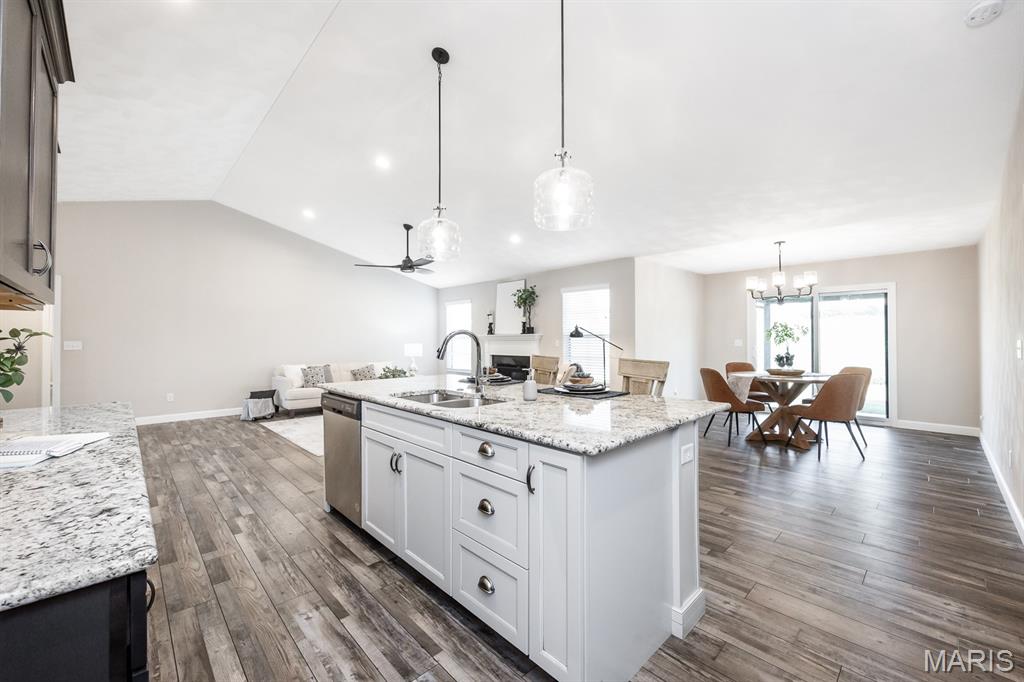 This like-new home sits on a quiet cul-de-sac with a beautiful open field behind it, offering exceptional privacy. From the charming front porch with craftsman-style columns to the lush landscaping and tasteful brick-and-siding exterior, the curb appeal is undeniable. Inside, warm LVP flooring flows from the foyer into the open-concept great room, complete with a vaulted ceiling and cozy gas fireplace. The vaulted design continues into the stunning kitchen, featuring granite countertops, a large center island, stainless steel appliances, and rich-toned cabinetry. A spacious walk-in pantry provides excellent storage for groceries and small appliances. The bright dining area overlooks the private backyard, where you’ll enjoy a covered patio—perfect for entertaining or relaxing outdoors. The split-bedroom floor plan is ideal, with the primary suite offering a spacious retreat, dual vanities, custom closets, and convenient access to the laundry room directly from the closet. The lower level is ready to be finished to suit your needs, complete with a bath rough-in. Additional highlights include a tankless water heater, community pool access, and use of the clubhouse for special occasions.