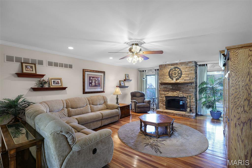 Imagine starting your mornings on the covered front porch, coffee in hand, while the landscaped corner lot greets you with peace. Step inside through the double decorative glass doors, and you’re welcomed by a spacious foyer and warm hardwood floors that carry you into a cozy living room. The stone fireplace, framed by two sunlit windows, creates the perfect gathering space for movie nights or quiet evenings by the fire.