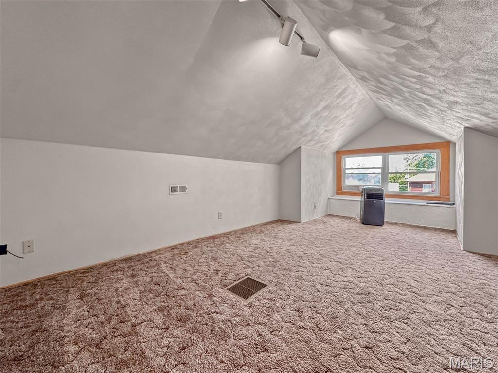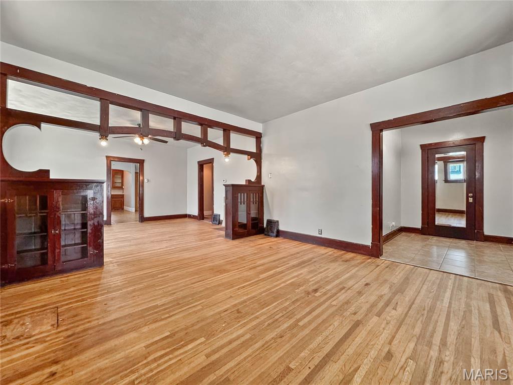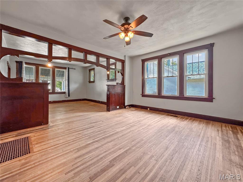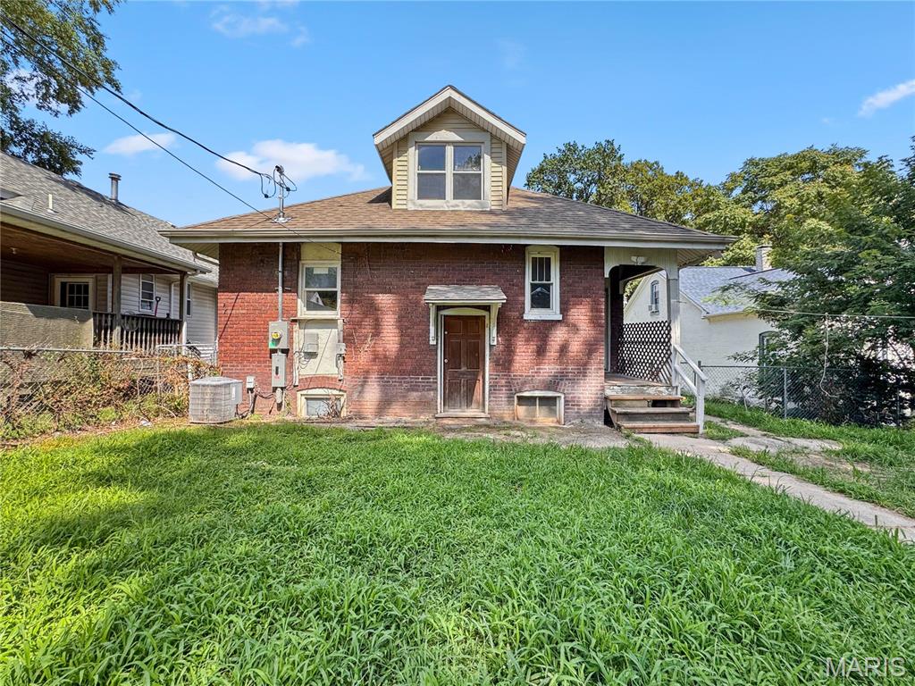 The 1920s were starting to roar when this big bungalow with 1800+ sq. ft. above grade came to 5th Street. All brick with tons of charm and art deco nods throughout. Large covered porch, perfect for sit and sip summer evenings. Fenced back yard, perfect for play or entertaining. Large formal foyer will charm as you stroll into the huge open living/dining with high ceilings and stunning wooden center beam with built in display cabinets on either end. Dining room is the heart of this home with access to living, kitchen and sleeping areas. Large eat in kitchen will be a chef’s delight with tons of space to stretch your creativity. Charming butler pantry is tucked away within an arched wall. 2 nice size bedrooms and central bath with tub/shower combo on the main. Frosted French doors take you to the original staircase and upper level 3rd bed suite complete with sleeping area, flex space and new bath with garden tub. Huge walk up basement with lots of space has been recently tuckpointed.