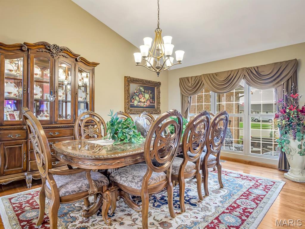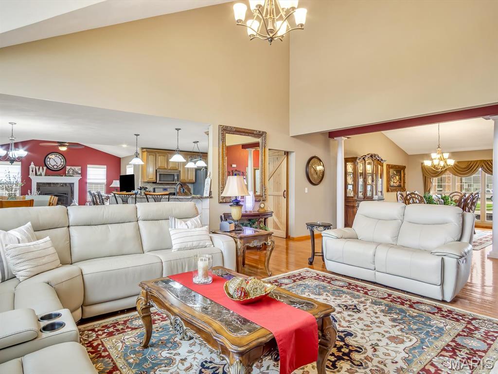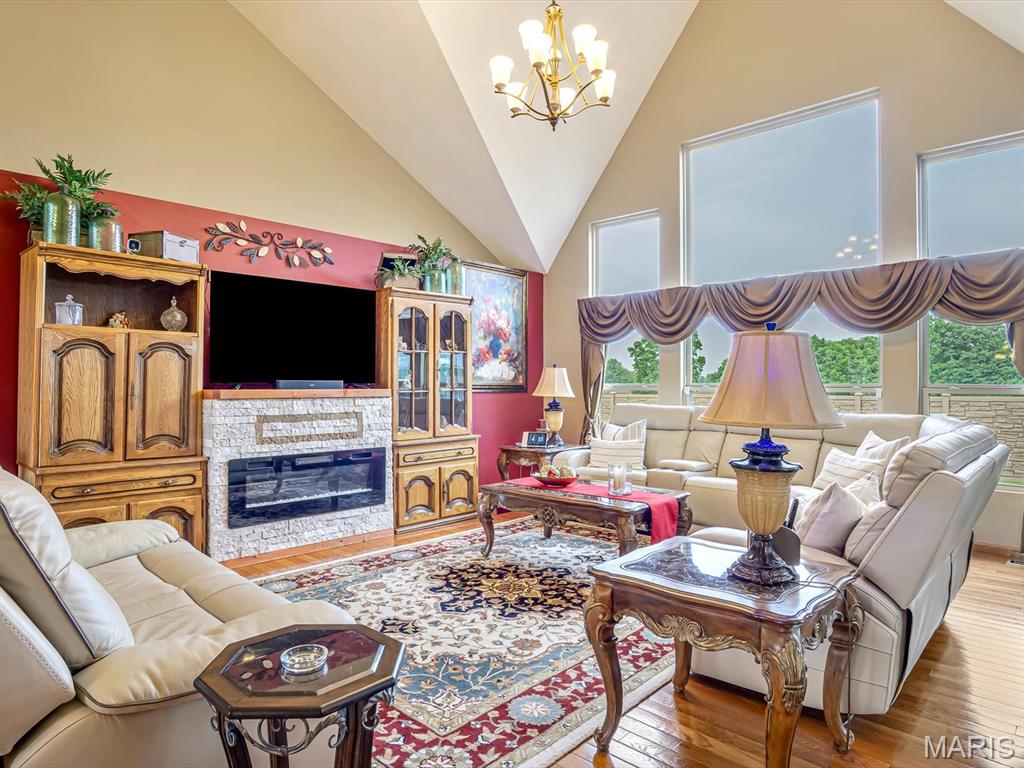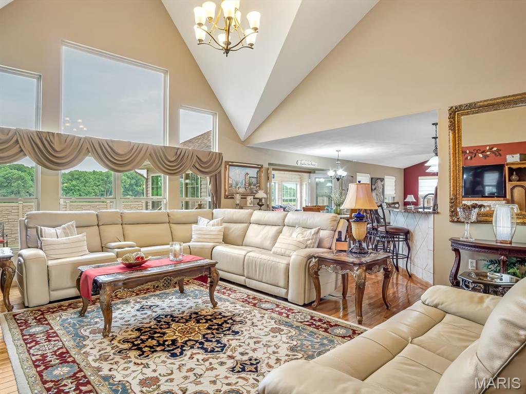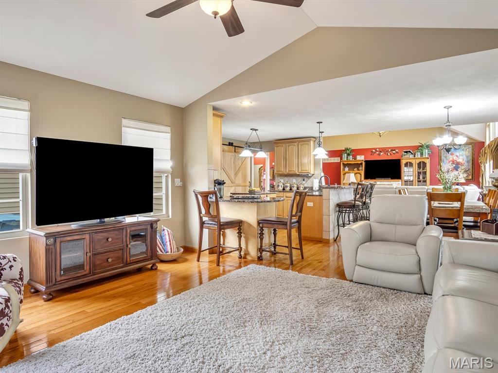 Begin with an inviting covered porch & front patio, leading into a fantastic space. The heart of the home is the Great Room, boasting a dramatic double vault ceiling, an expansive window wall, all complemented by beautiful Bruce hardwood flooring throughout the main level.