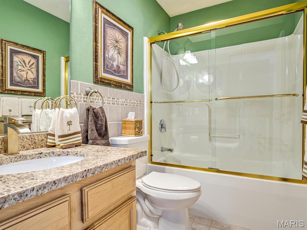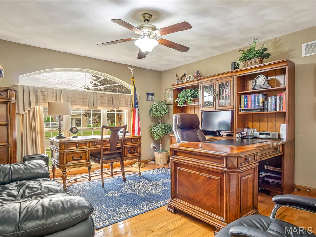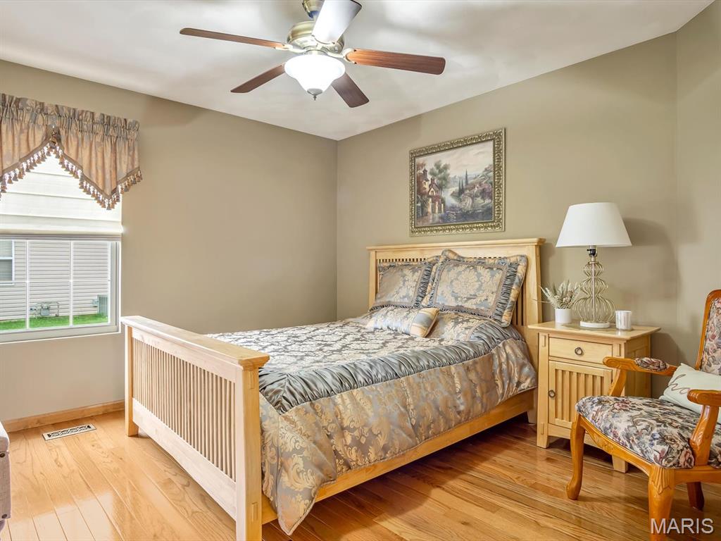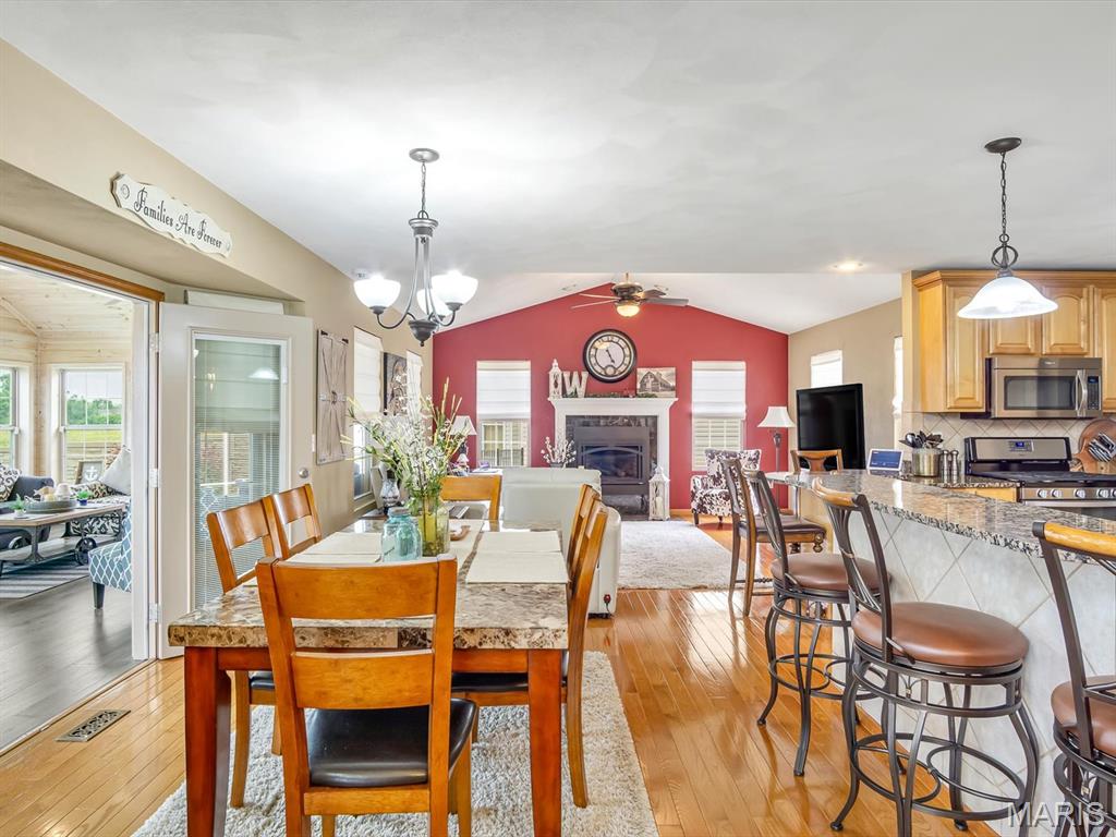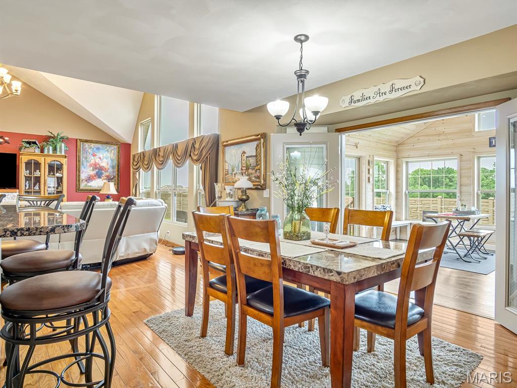 Begin with an inviting covered porch & front patio, leading into a fantastic space. The heart of the home is the Great Room, boasting a dramatic double vault ceiling, an expansive window wall, all complemented by beautiful Bruce hardwood flooring throughout the main level.