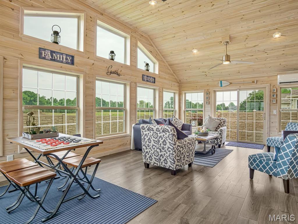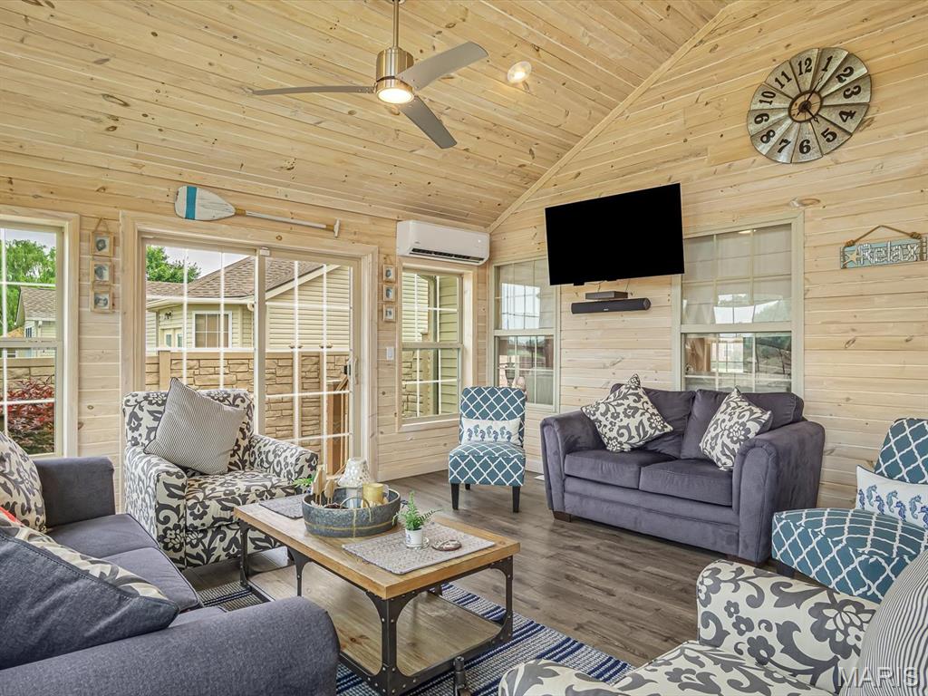French doors open to a magnificent four-season sunroom, a serene oasis with whitewashed pine, a soaring 12-foot ceiling, and a dedicated mini-split HVAC system installed in 2022.