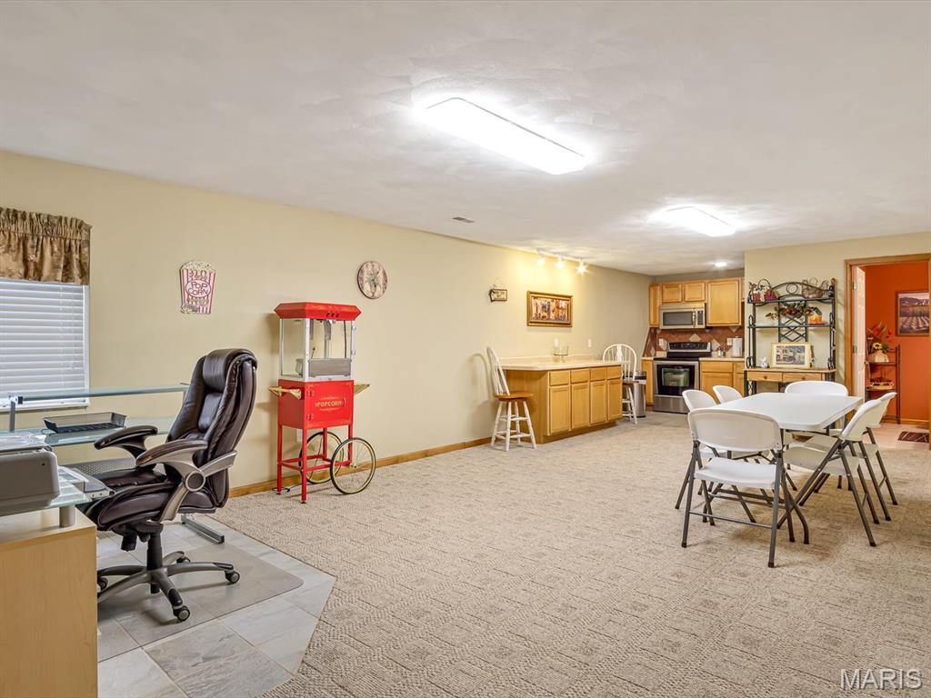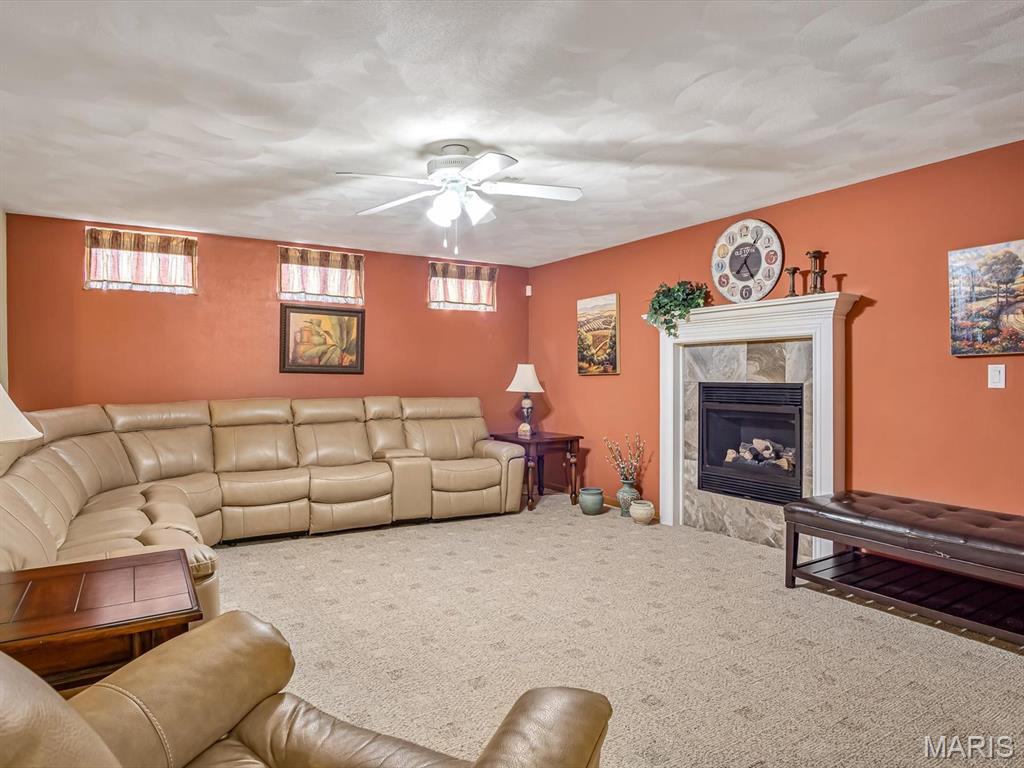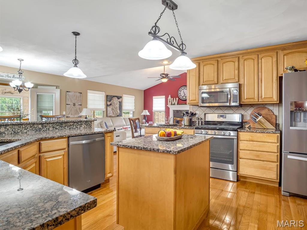 The gourmet kitchen is a chef’s dream, featuring custom cabinetry, a large island with a breakfast bar, gleaming granite countertops, high-end appliances, and a spacious pantry. Hearth Room offers a gas fireplace, perfect for intimate gatherings.