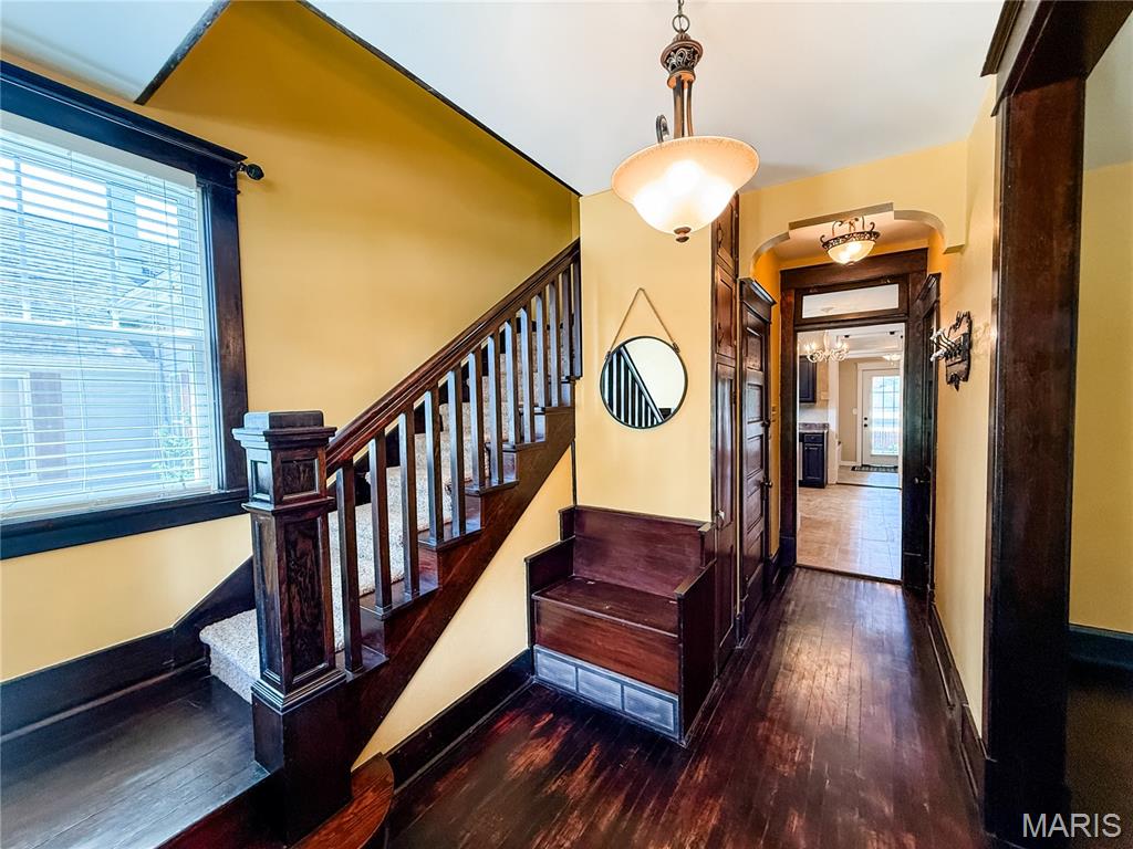 This historic Craftsman-style home offers outstanding curb appeal and a seamless blend of character and updates. Inside, you’ll find stunning period millwork, custom built-ins with leaded glass, hardwood floors, and a stylish kitchen with stainless steel appliances. The main level features a convenient laundry and mudroom, a full bathroom, and a versatile office space. Upstairs are three generously sized bedrooms and a full bathroom—the largest bedroom boasts a spacious private balcony overlooking the backyard. The clean 800 sq ft unfinished basement can be accessed from the interior and exterior of the home. Updated electrical and plumbing throughout. A 12’x36′ pavilion at the rear of the property provides covered parking or the perfect space for outdoor entertaining.