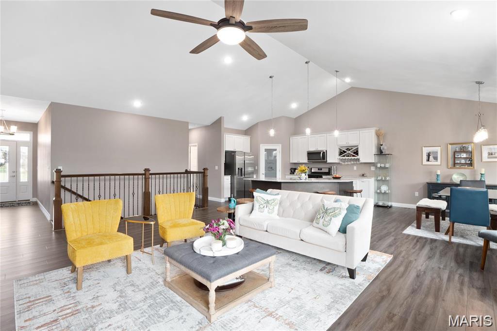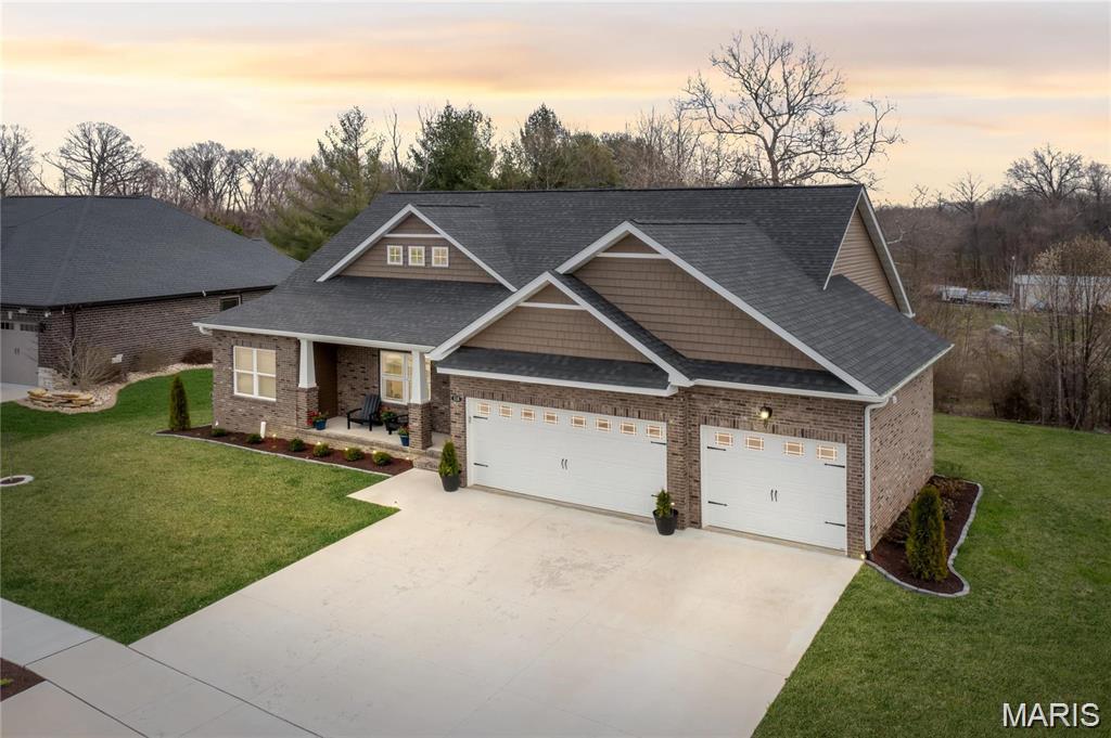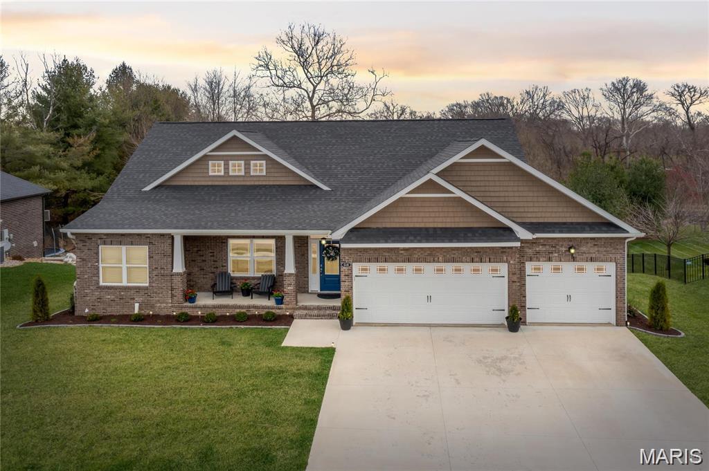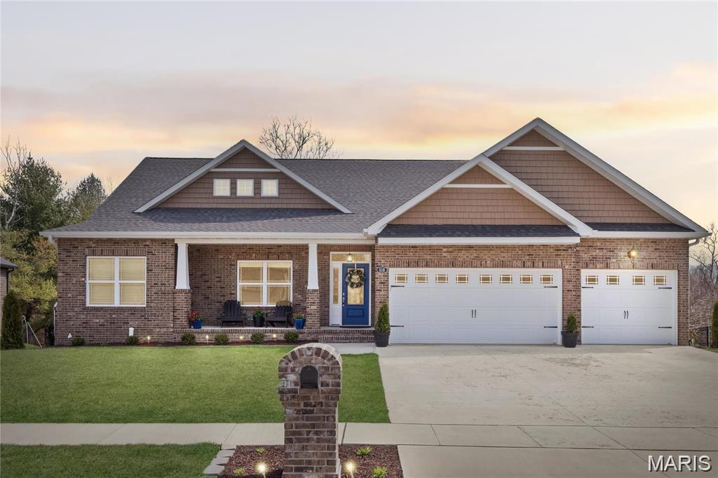 YOU WILL LOVE THIS BEAUTIFUL RANCH Built in 2021. This beautiful ranch offers a spacious open floor plan w/ a split bedroom concept offering the master on one side of the home & two other bedrooms on the other side. The main level has a gourmet kitchen featuring a butterfly island with granite countertops, showcase white cabinetry, and stainless appliances! Home offers a spacious open floor plan w/ a split bedroom concept offering the master on one side of the home & two other bedrooms on the other side. Grand master suite with soaking tub and built-in closets. Lower level bonus entertaining room, full bath,4th bedroom, abundance of storage and walkout to wooded lot! Perfect lot for a pool!!Other upgrades include an irrigation system, custom shades, extended patio and deck, three car garage & more.Don’t miss this opportunity close to SAFB, major highways, hospitals, and a short commute to St. Louis! Call your favorite agent today to see this one of a kind home!