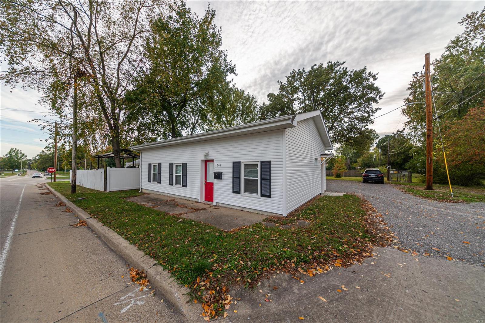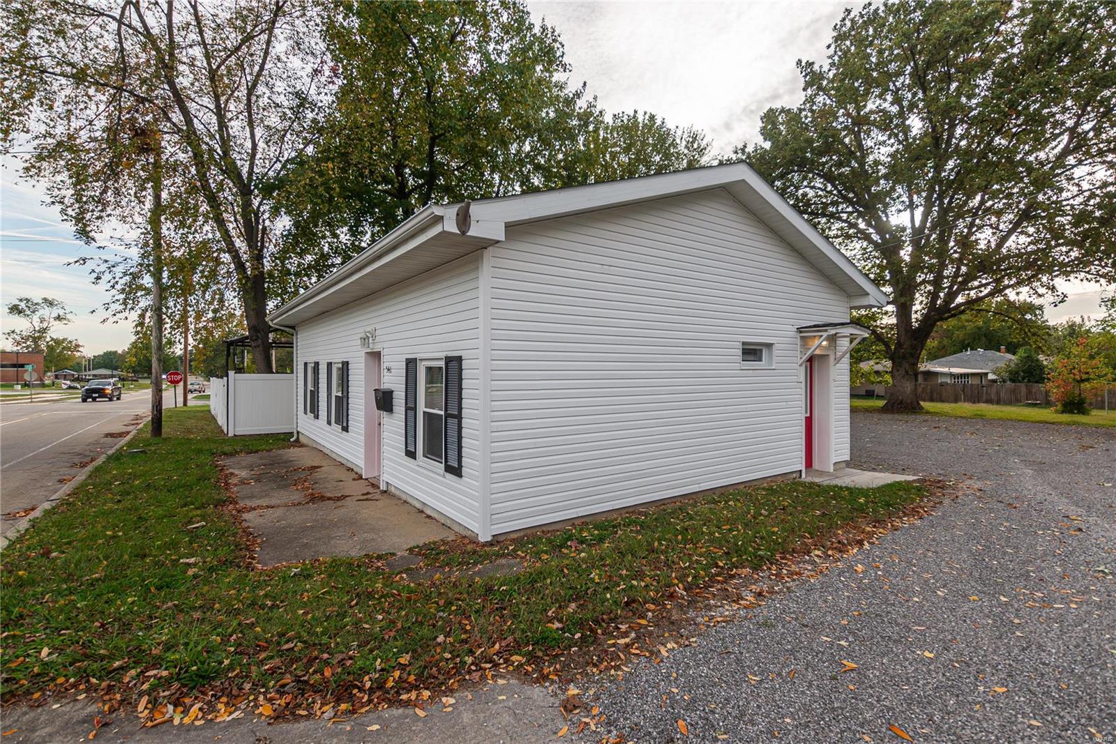 windows, siding, a storage room door, vinyl privacy fencing, and fresh gravel. Inside,