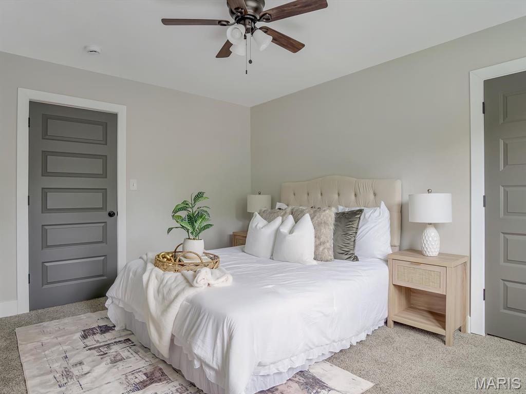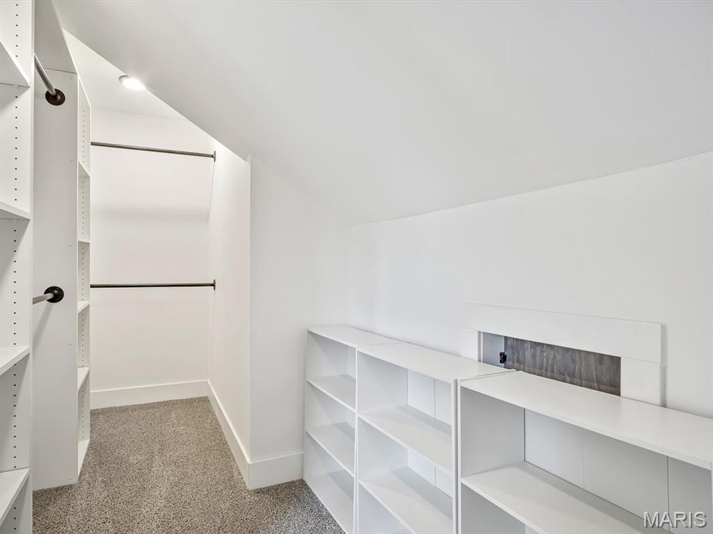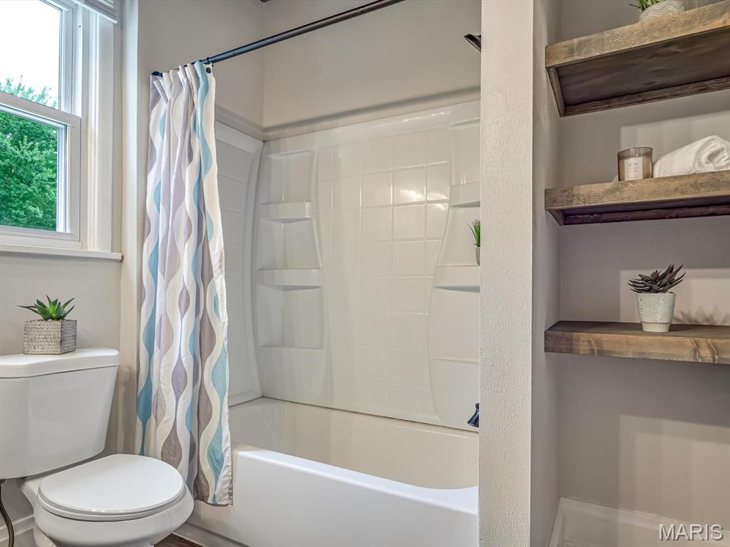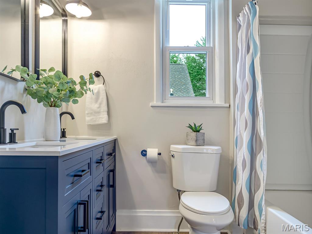 The upstairs primary suite includes a walk-in closet with built-in shelving and a modern en-suite with walk-in shower. The main level bathroom features a dual-sink vanity and built-in storage, while the lower level includes a half bath with laundry access and bonus living space.