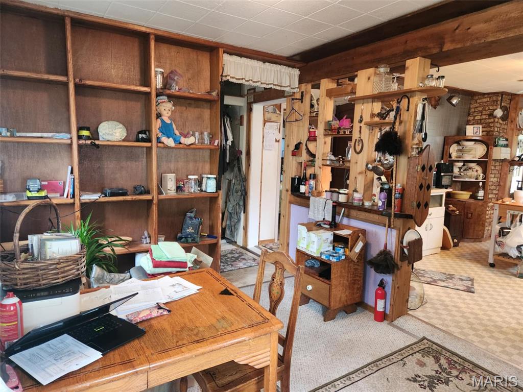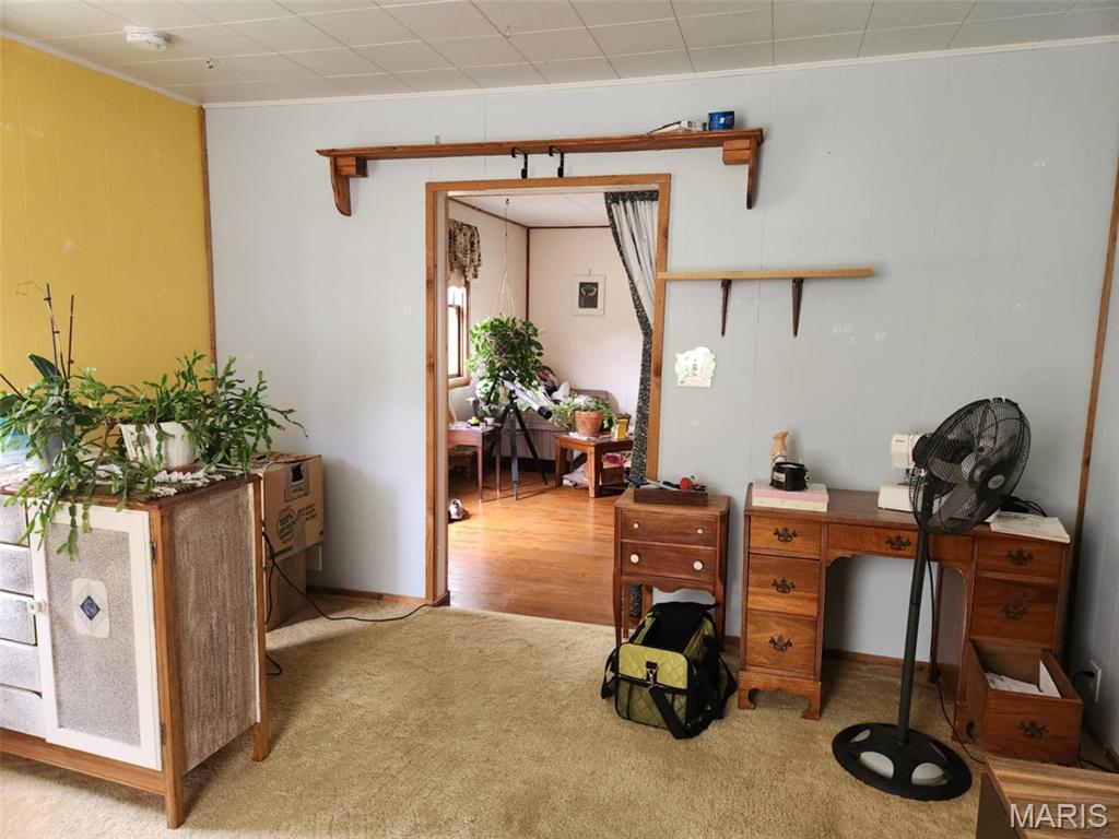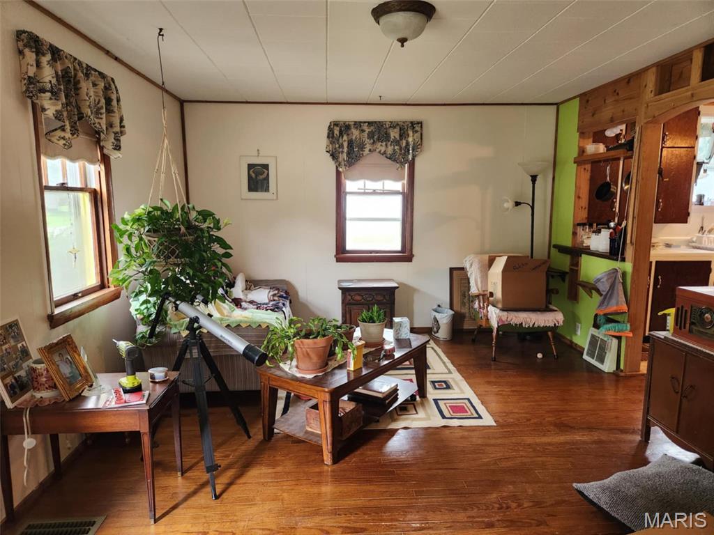 Small town living within a couple blocks of Post Office, park, & school. Comfortable cottage with additional living space on 2nd floor. Living Room has attractive wood floor. Wood flooring can be found under carpeting in bedrooms, as well. Lots of wood shelving has been added for knickknacks, books, collectibles, etc. The 2nd floor has a window ac unit, but a heat source is still needed to make it a bedroom, den, toy room, craft room…..whatever suits your needs. All appliances to stay plus yard care implements, ladders, shelving in shed & basement, picnic table, & window treatments. Home has been completely rewired. Exterior outlet wired for welder. Chicken Coop with electric. 2019 furnace. 2017 50 year architectural shingled roof with all new decking. 2025 sump pump. 1 car garage with addition has been converted to workshop/ storage shed, but could be converted back. A long row of Rose of Sharon trees offers privacy and beauty to the yard. Large garden spot in side yard. Backdoor access to a concrete patio and driveway. Several lights and outlets have been added to the basement for hobby/workshop use and laundry, too.