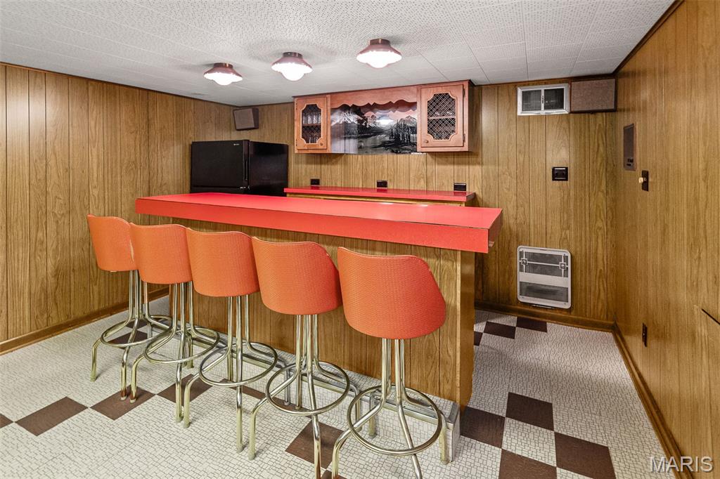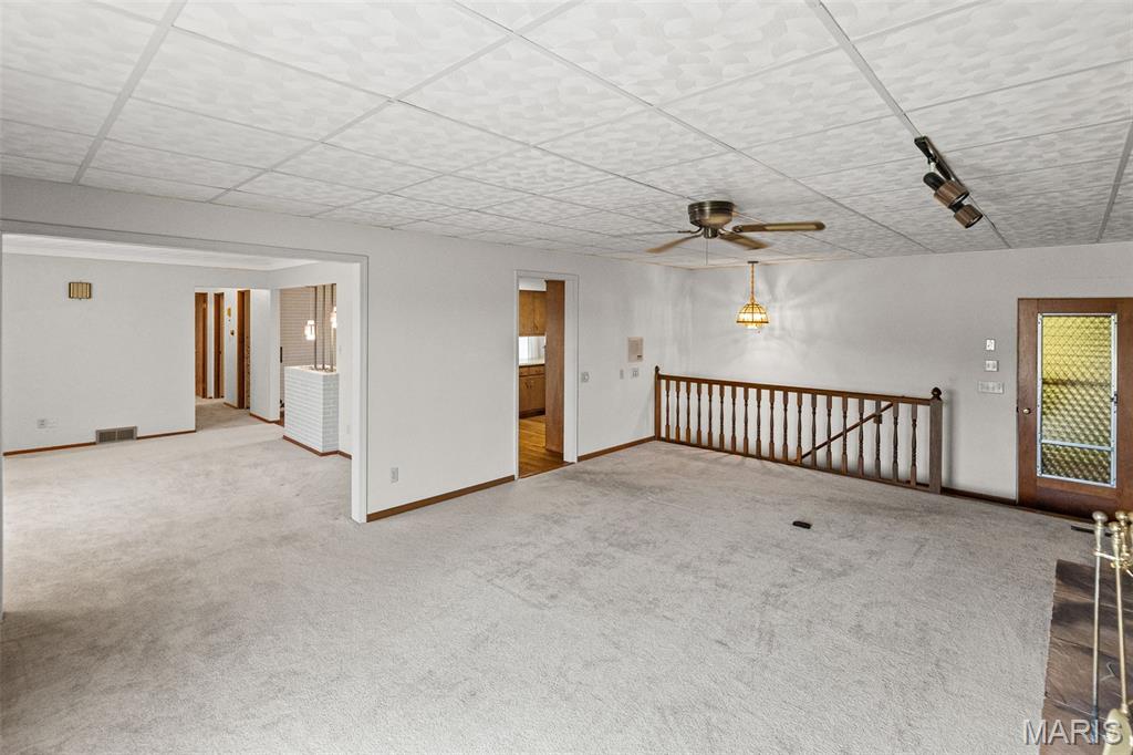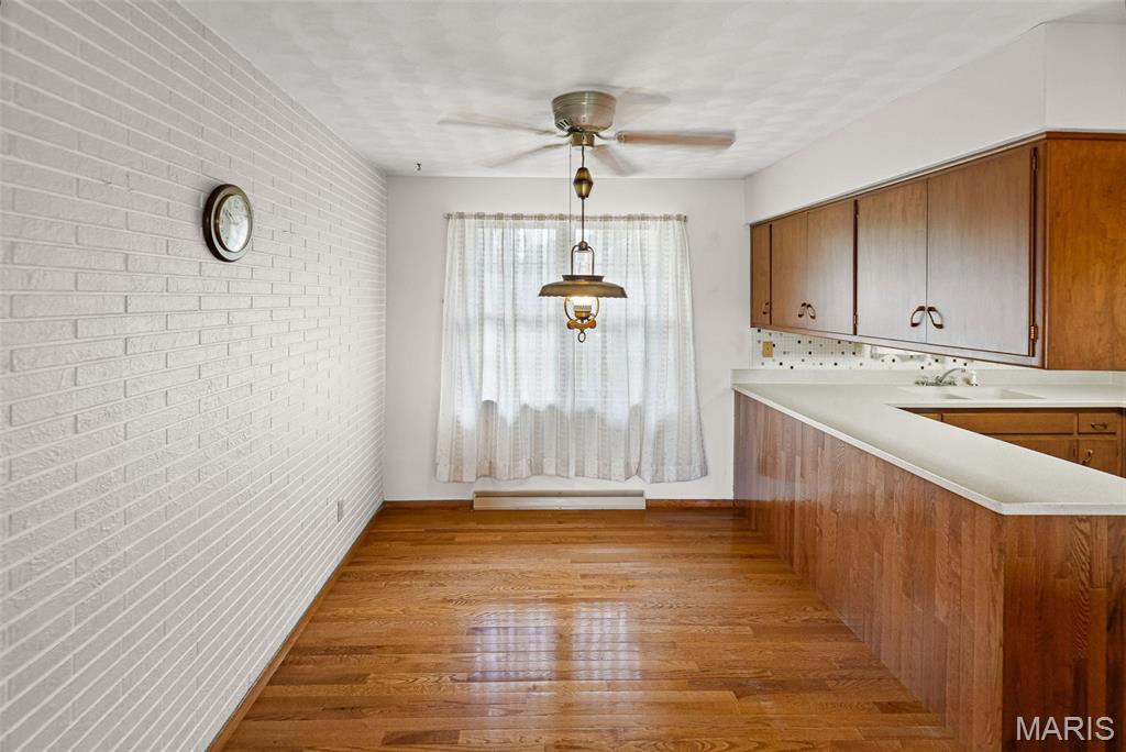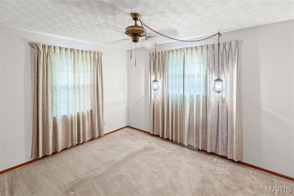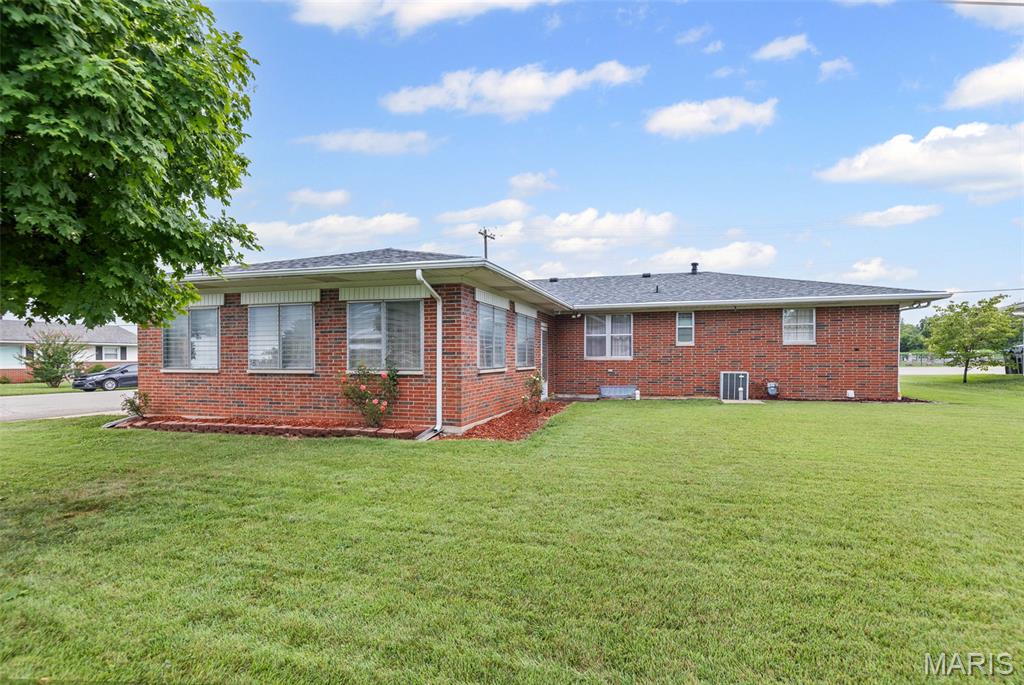 Well maintained 1 owner brick ranch with 3BR/1.5 bath situated on a corner lot. Large FR w/a wood-burning stone fireplace. LR has bay window, coffered ceilings w/medallion. Kitchen has Corian counter tops, ceramic backsplash, electric cook-top, built-in oven & refrigerator. Kitchen/Dining have wood floors. Bath w/walk-in shower & ceramic tiled walls. Freshly painted walls & carpets cleaned on main level. FR has open staircase that leads to the partially finished basement w/a 1/2 BA, huge FR, dry bar w/stools & cabinetry & pool table included. This room is ready for entertaining complete with an electric freestanding FP. You will love the floors & the Retro feeling of this FR that is perfect for entertaining. The main level also features some of the Retro feeling you find in basement. 2 car side entry garage w/hot & cold water. Nice patio w/partial brick wall. Roof & Utility bldg 2025. Sewer line from house to street replaced approx. 15 yrs ago. Water heater approx. 8 yrs.