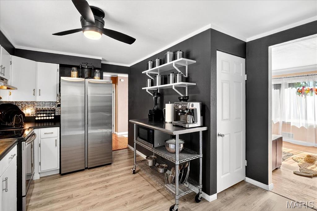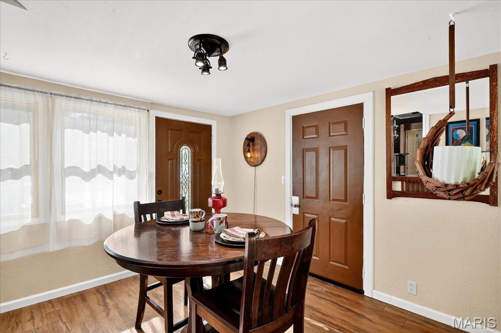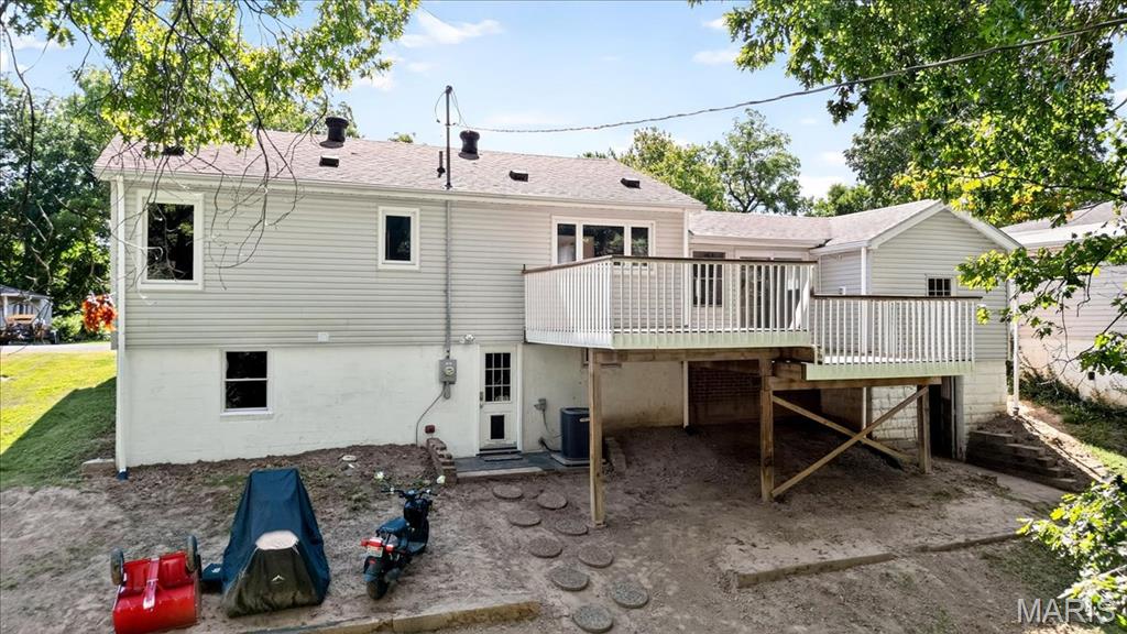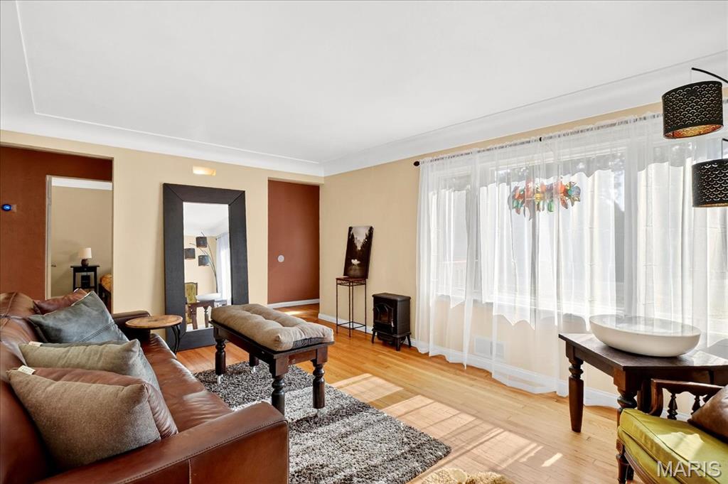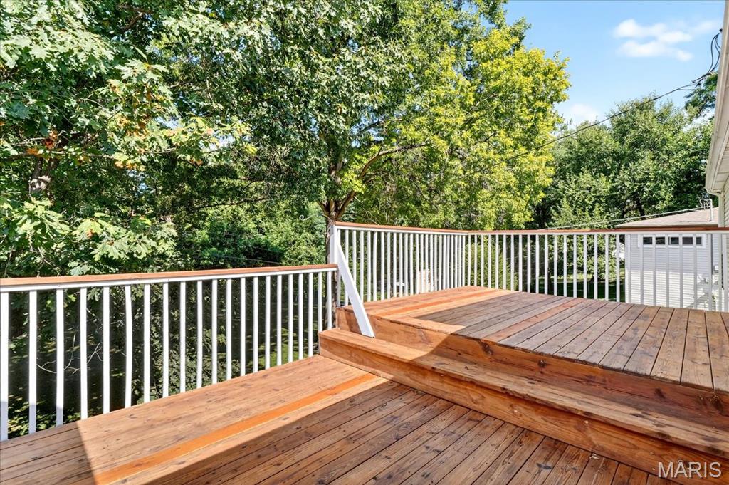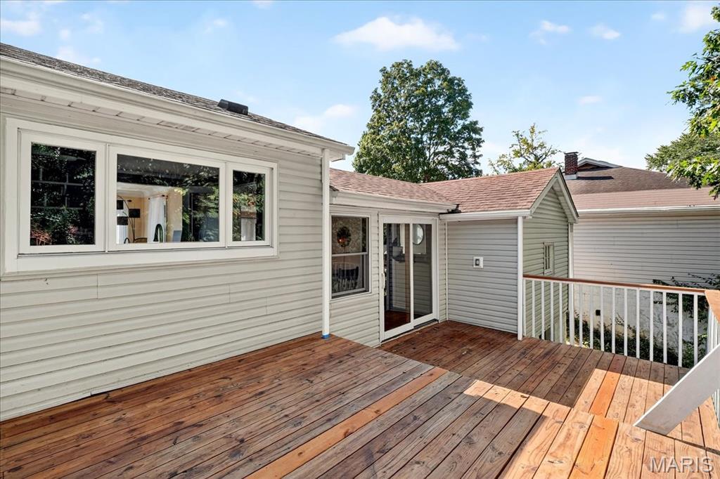 Move-in ready 2 bed, 2 bath home in a fantastic location—close to shopping, restaurants, and highways while still tucked on a quiet street! The bright living room is filled with natural light and features gleaming hardwood floors. The kitchen offers refinished vintage wood cabinets, stainless steel appliances, and a window overlooking the large backyard. Fresh paint brightens both bedrooms, the living room, and main bath. A finished breezeway, currently used as a dining room, adds extra living space. Step outside to relax or entertain on the impressive 12×44 deck! The finished walkout lower level provides a spacious rec room with bar, second bath, storage, and bonus room potential. Newer Anderson windows with transferable warranty give added peace of mind. The home is already city compliant, and seller is including a $595 Home Warranty Inc. plan.