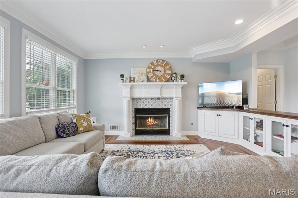 Custom finishes shine throughout: a marble-tiled entry, built-in bookcases, a boldly tiled fireplace, and dramatic crown molding that adds elegance in every room. The chef’s kitchen showcases quartz counters, an oversized island, custom cabinetry, double wall ovens, a connected dining room, and cozy breakfast nook. Windows stretched tall and wide capture panoramic lake views from nearly every room.