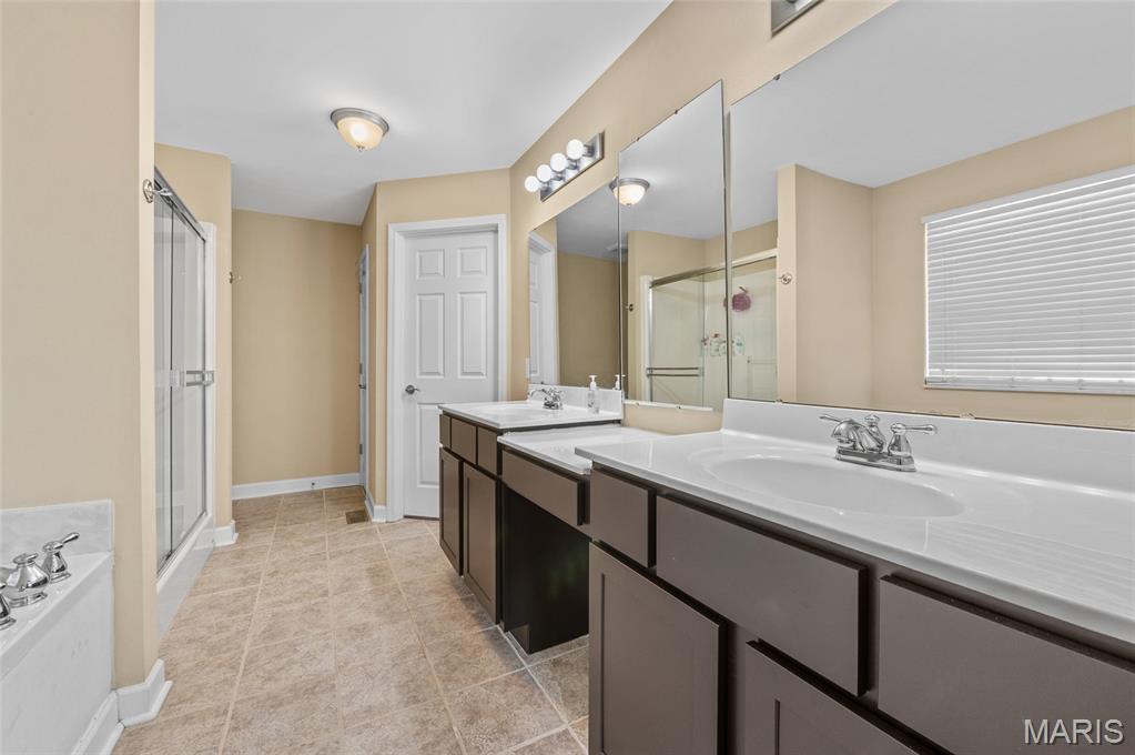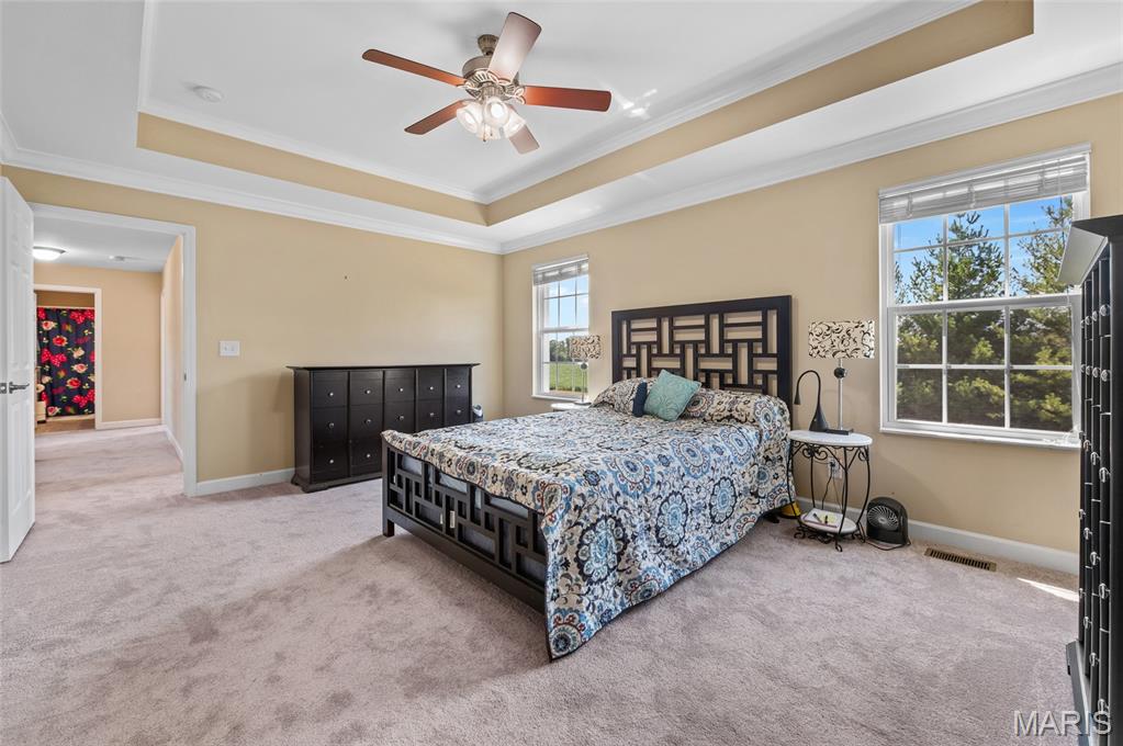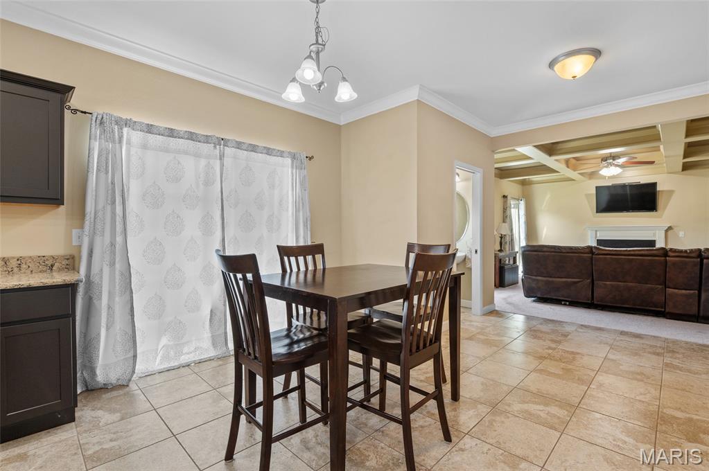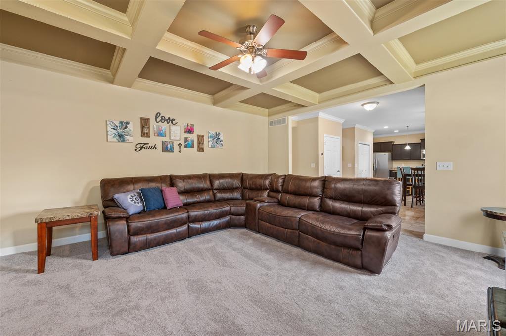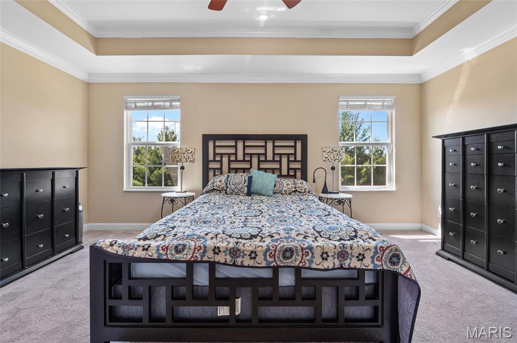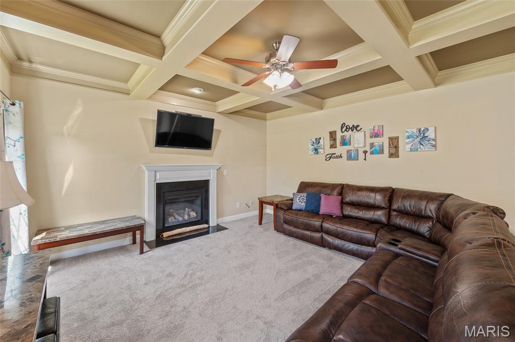 The living room is the heart of the home with its coffered ceiling and cozy gas fireplace, perfect for evenings with family and friends. Upstairs, the primary suite offers a tray ceiling, spa-like bath with soaking tub, dual vanities, and two oversized walk-in closets—one with direct access to the laundry room for everyday convenience. Three additional generously sized bedrooms share a full hall bath.