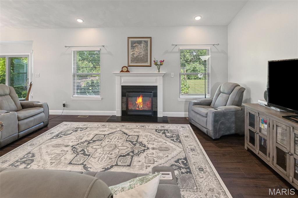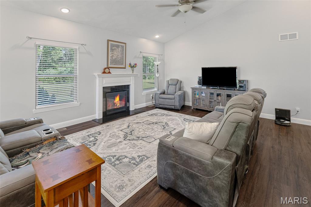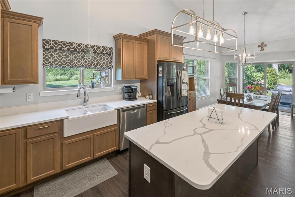 BACKYARD OASIS! This beautiful 3-bedroom, 2-bath ranch offers open-concept living in a highly desirable neighborhood. The living room features vaulted ceilings, LVP flooring, and a gas fireplace, flowing into the kitchen and dining area. The kitchen is equipped with a large island, quartz countertops, soft-close cabinetry, stainless steel appliances(2023), farmhouse apron sink, and pantry.