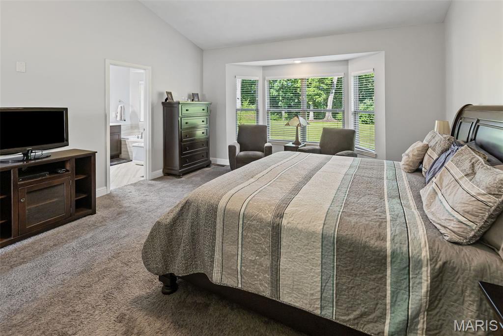 The primary suite includes a walk-in closet, custom blinds, and an ensuite bath with dual vanities, a soaking tub, and a separate shower. Two additional bedrooms, a full hall bath, and a first-floor laundry complete the main level. Washer and dryer stay.